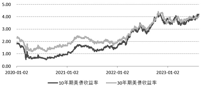 在美国公布7月CPI等通胀数据之后,短端美债收益率明显攀升,且市场对于美联储在9月加息与否分歧有所扩大。由于美国近期公布的制造业PMI、零售销售等数据好于预期,市场对于美国实现抑制通胀且不会导致经济衰退的软着陆预期有所回升,叠加美国财政部融资需求攀升,带动长端美债收益率同样回升。 展望后市,美联储近几个月继续加息的可能性并不大,因美联储需要关注高利率对经济的滞后性影响,以及通胀温和回落的基本面;但也不大可能转为降息,因美国就业市场依旧稳健,失业率处于历史低位,薪资增长依旧较快,工资-通胀螺旋风险尚未彻底解除。因此,美债收益率可能会在较长时间保持高位,直到经济降温,美债收益率才会因经济前景转弱而下行。 美国财政发债规模急剧攀升,美债价格下跌 近期,美债收益率出现明显的攀升,除了对货币政策敏感的2年期美债收益率大幅上行之外,反映美国经济前景及财政融资需求的长端美债收益率也出现了大幅的攀升。美国财政部发债规模增加,意味着美债供应增加,而美债需求随着美联储缩表而减少,从而导致美债价格下跌,收益率攀升。截至8月15日,10年期和30年期美债收益率分别攀升至4.21%和4.32%,去年同期为2.79%和3.1%。 美债收益率尤其是长端美债收益率大幅攀升主要是美国财政部发债融资需求在最近几个月大幅增长驱动的。美国财政部在一份声明中表示,由于预期的中长期借款需求,财政部计划从2023年8月到10月开始逐步增加息票发行规模。美国财政部公布的数据显示,预计7月到9月的净借款规模上调至1万亿美元,远超5月初财政部预期的7330亿美元。