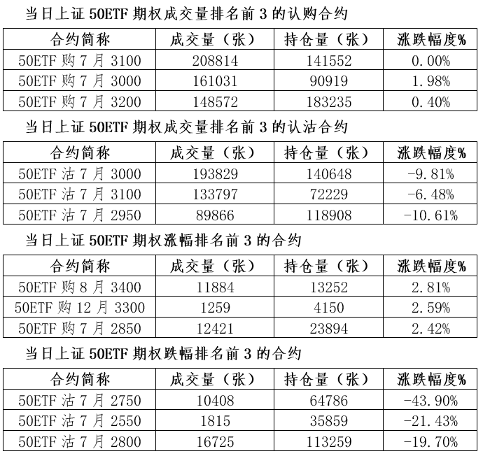 7月4日上证50ETF现货报收于3.063元,上涨0.16%,上证50ETF期权总成交面额519.074亿元,期现成交比为0.15,权利金成交金额10.165亿元;合约总成交1704279张,较上一交易日减少7.28%,总持仓2547759张,较上一交易日增加2.54%。认沽认购比为0.88(上一交易日认沽认购比0.79)。