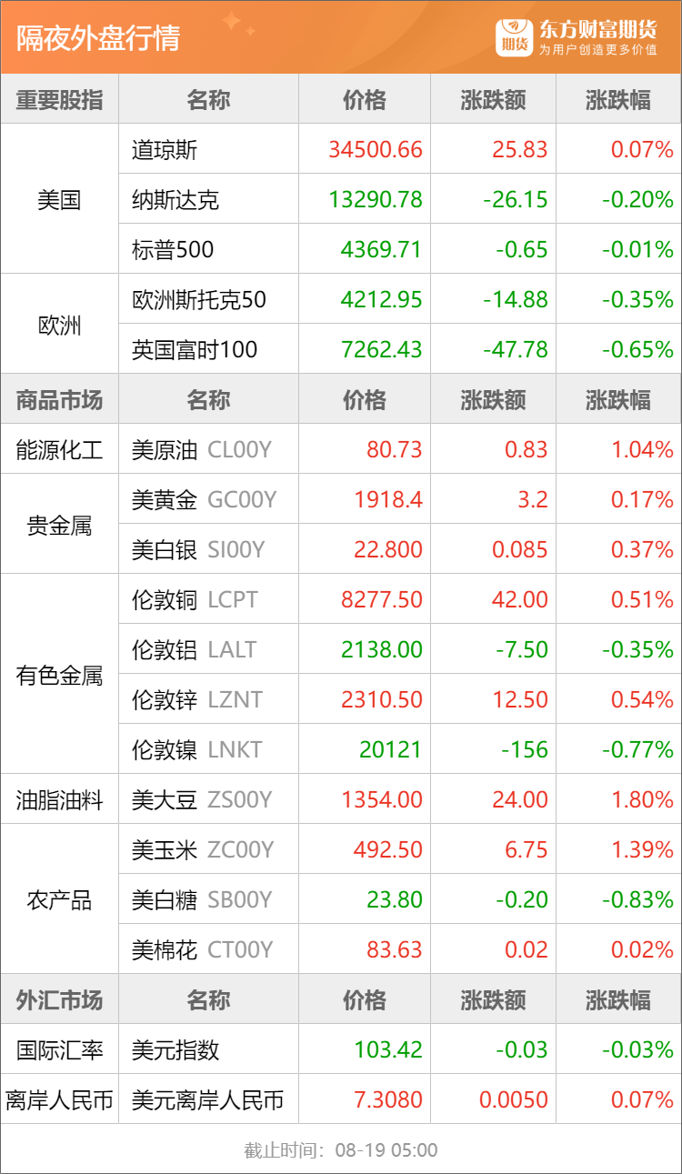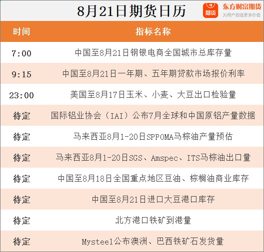 东方财富期货早餐 8月21日 周一