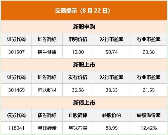 沪深股市:8月21日,沪指跌1.24%,报3092.98点,深成指跌1.32%,报10320.39点,创业板指跌1.6%,报2084.97点。环保、公用事业、燃气板块涨幅居前,航空机场、保险、证券、医药板块跌幅居前。 沪深港通:8月21日,北向资金净卖出64.12亿元。贵州茅台、隆基绿能、招商银行分别获净卖出9.94亿元、7.34亿元、6.99亿元。华泰证券净买入额居首,金额为5.34亿元。 龙虎榜:8月21日,日内上榜龙虎榜个股中,资金净流入最多的是三安光电,为2.02亿元。机构参与龙虎榜中个股共涉及26股,其中15股被机构净买入,华是科技被买入最多,为1.02亿元。另外11股被机构净卖出,白云机场被卖出最多,为4.24亿元。 融资融券:截至8月18日,上交所融资余额报7794.89亿元,较前一交易日减少18.52亿元;深交所融资余额报7045.17亿元,较前一交易日减少28.49亿元;两市合计14840.06亿元,较前一交易日减少47.01亿元。 北交所:联合中国结算发布实施修订后的《北京证券交易所股票向不特定合格投资者公开发行与承销业务实施细则》及两件配套指南,对北交所新股发行上市流程进行了优化。本次发行上市流程优化,在不增加市场主体负担的前提下,着眼于内部流程改进和效率挖潜,将新股发行上市流程整体用时缩减了20%左右。 中基协:发布2023年7月份《企业资产证券化业务备案运行情况简报》显示,2023年7月份,企业资产证券化产品共备案确认110只,新增备案规模合计1126.24亿元。7月份新增备案规模环比增长29.58%,同比降低19.45%。 央广网:活跃资本市场一揽子措施出台,A股或成全球资产配置的“核心战场”。专家认为,经历政策底、经济底、情绪底的震荡夯实以后,A股市场有望迎来新一轮回报周期。未来,随着一系列监管政策与措施的落地,资本市场有望与经济修复共振,市场的悲观情绪逐渐修复,A股市场成为全球投资者积极进行资产配置的核心战场。 财联社:8月21日,基金、券商及券商资管密集出手自购,截至发稿,已有16家机构自购合计金额达10亿元。具体来看,上述16家宣布自购的机构中,公募基金为绝对的主力,有13家基金公司宣布将于近日自购旗下权益类基金,各家公告拟自购金额均不低于5000万元,其中华商基金拟自购金额最高,不低于8000万元。 界面新闻:近日,关于再融资暂缓的“小作文”式传言成为行业关注点,已有多家上市公司叫停再融资。截至8月21日,年内共有31单再融资项目被终止,其中沪市12单,深市19单,远超去年全年终止的21单。此前,有市场消息称,再融资或将暂停。界面新闻从多位投行人士处了解到,目前资本市场再融资节奏确实发生些许变化。 央视新闻:央视在一个《擦亮眼睛溯源“抹黑小作文”》节目中指出,近期“抹黑小作文”频频,引发经济学家被迫火线打假。国家“活跃资本市场,提振投资者信心”,希望带来资本市场的健康发展,可频繁上演的“抹黑小作文”,抱着各种目的在资本市场“带节奏”,打击信心,扰乱资本市场正常秩序。在此奉劝各位在投资的时候,一定擦亮双眼,用理性和理智分析做出判断,谨防被人带了错误节奏。