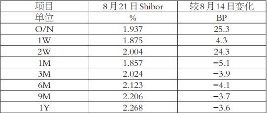 受阶段性资金需求上升影响,国内短期市场利率持续上升,中长期利率则受年内第二次降息影响,延续弱势格局。截至8月21日,上海银行间同业拆放利率(SHIBOR)隔夜、1周期、2周期利率分别报收于1.937%、1.875%、2.004%,较8月14日分别上升25.3、4.3、24.3个基点;1月期、3月期、6月期、9月期、1年期利率分别报收于1.857%、2.024%、2.123%、2.206%、2.268%,较8月14日分别下降5.1、3.9、4.1、3.7、3.6个基点。