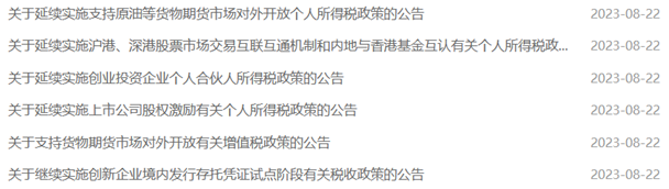 8月22日,财政部官网连续发布6则公告,财政部、税务总局、中国证监会等部门优化、延续了一揽子支持创新企业境内发行存托凭证(下称创新企业CDR)、货物期货市场、创投企业合伙人、沪深港通等领域的税收政策。 相关税收优惠涉及到个人所得税、企业所得税、增值税、印花税等,主要是对已出台政策的再延续。 ![]() 财政部有关负责人日前表示,下一步,财政部将加大宏观政策调控力度,推动各项财税政策尽早落地见效,延续、优化、完善并落实好减税降费政策。 优化、延续创新企业CDR税收减免支持 为继续支持实施创新驱动发展战略,财政部发布《关于继续实施创新企业境内发行存托凭证试点阶段有关税收政策的公告》,明确自2023年9月21日至2025年12月31日,对投资者转让创新企业CDR取得的差价所得和持有创新企业CDR取得的股息红利所得等提供税收减免优惠。 对于个人投资者,其转让创新企业CDR取得的差价所得,暂免征收个人所得税;其转让创新企业CDR取得的差价收入,暂免征收增值税;其持有创新企业CDR取得的股息红利所得,实施股息红利差别化个人所得税政策。 对于企业投资者,其转让创新企业CDR取得的差价所得和持有创新企业CDR取得的股息红利所得,按转让股票差价所得和持有股票的股息红利所得政策规定征免企业所得税。 对于公募证券投资基金(封闭式证券投资基金、开放式证券投资基金),其转让创新企业CDR取得的差价所得和持有创新企业CDR取得的股息红利所得,按公募证券投资基金税收政策规定暂不征收企业所得税;对公募证券投资基金管理人运营基金过程中转让创新企业CDR取得的差价收入,暂免征收增值税。 对于合格境外机构投资者(QFII)、人民币合格境外机构投资者(RQFII),其转让创新企业CDR取得的差价所得和持有创新企业CDR取得的股息红利所得,视同转让或持有据以发行创新企业CDR的基础股票取得的权益性资产转让所得和股息红利所得征免企业所得税;其委托境内公司转让创新企业CDR取得的差价收入,暂免征收增值税。 对于单位投资者转让创新企业CDR取得的差价收入,按金融商品转让政策规定征免增值税。 此外,在上海证券交易所、深圳证券交易所转让创新企业CDR,按照实际成交金额,由出让方按1‰的税率缴纳证券交易印花税。 优化、延续货物期货市场对外开放税收减免支持 为支持货物期货市场对外开放,财政部、税务总局发布《关于支持货物期货市场对外开放有关增值税政策的公告》。财政部、税务总局、中国证监会发布《关于延续实施支持原油等货物期货市场对外开放个人所得税政策的公告》。两项公告的相关政策将执行至2027年12月31日。 《关于支持货物期货市场对外开放有关增值税政策的公告》提出,对经国务院批准对外开放的货物期货品种保税交割业务,暂免征收增值税。期货交易中实际交割的货物,如果发生进口或者出口的,统一按照现行货物进出口税收政策执行。非保税货物发生的期货实物交割按相关规定执行。 《关于延续实施支持原油等货物期货市场对外开放个人所得税政策的公告》提出,对境外个人投资者投资经国务院批准对外开放的中国境内原油等货物期货品种取得的所得,暂免征收个人所得税。 延续上市公司股权激励个税优惠 为继续支持企业创新发展,财政部、税务总局发布《关于延续实施上市公司股权激励有关个人所得税政策的公告》,相关政策将执行至2027年12月31日。 公告提出,居民个人取得股票期权、股票增值权、限制性股票、股权奖励等股权激励(下称股权激励),符合有关规定相关条件的,不并入当年综合所得,全额单独适用综合所得税率表,计算纳税。计算公式为:应纳税额=股权激励收入×适用税率-速算扣除数 为创投企业个人合伙人提供个税优惠 为继续支持创业投资企业(含创投基金,下称创投企业)发展,财政部、税务总局、国家发展改革委、中国证监会发布《关于延续实施创业投资企业个人合伙人所得税政策的公告》,提供个人所得税优惠支持,相关政策将执行至2027年12月31日。 公告提出,创投企业可以选择按单一投资基金核算或者按创投企业年度所得整体核算两种方式之一,对其个人合伙人来源于创投企业的所得计算个人所得税应纳税额。 其中,创投企业选择按单一投资基金核算的,其个人合伙人从该基金应分得的股权转让所得和股息红利所得,按照20%税率计算缴纳个人所得税。 创投企业选择按年度所得整体核算的,其个人合伙人应从创投企业取得的所得,按照“经营所得”项目、5%-35%的超额累进税率计算缴纳个人所得税。 公告提出,创投企业选择按单一投资基金核算或按创投企业年度所得整体核算后,3年内不能变更。 延续沪港通、深港通、基金互认个税优惠 财政部、税务总局、中国证监会发布《关于延续实施沪港、深港股票市场交易互联互通机制和内地与香港基金互认有关个人所得税政策的公告》,相关政策将执行至2027年12月31日。 公告提出,对内地个人投资者通过沪港通、深港通投资香港联交所上市股票取得的转让差价所得和通过基金互认买卖香港基金份额取得的转让差价所得,继续暂免征收个人所得税。 相关报道利好来了!事关印花税、个人所得税 五项资本市场税收优惠政策获延续 财政部解读:稳定预期、提振信心 一大批税收优惠政策公布 全方位多层次支持资本市场
