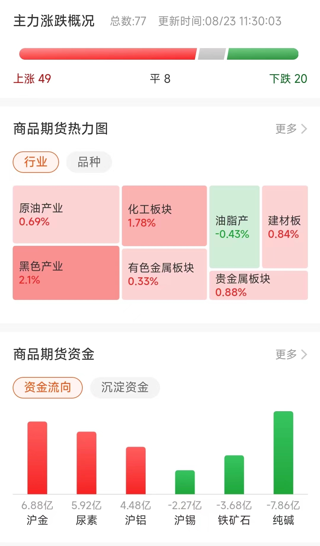 行情总览![]() 宏观要闻学习时报:我国房地产市场供求关系正在发生深刻变化,城镇住房矛盾已从总量维度转向结构性问题,房地产业多年来“高负债、高杠杆、高周转”发展模式已难以为继,房地产市场正在朝着价格稳、结构优、质量高的方向实现自我修复和转型升级。 经济日报:“房住不炒”是促进房地产市场平稳健康发展的一项总原则,不应也不会改变,须长期坚持。房地产是国民经济的支柱产业,这是客观事实。不能夸大其作用,像过去一样对这一行业存在过度依赖的倾向;也不能轻视其在宏观经济中的作用、对上下游产业的带动作用。 财联社:摩根大通经济学家Daniel Silver估计,若根据周三的QCEW进行初步基准调整,在截至今年3月的一年内,美国的新增就业人口会比目前已发布数据减少将近50万,即每个月减少约4万个就业岗位。 品种资讯钢材:重点统计钢铁企业共生产粗钢2214.98万吨、生铁1997.08万吨、钢材2154.99万吨。其中粗钢日产221.50万吨,环比增长2.89%;生铁日产199.71万吨,环比增长1.04%;钢材日产215.50万吨,环比增长5.44%。据此估算,本旬全国日产粗钢298.40万吨、环比增长1.71%,日产生铁254.02万吨、环比增长1.02%,日产钢材376.67万吨,环比增长4.12%。(中钢协) 截至08月23日当周,找钢网库存分析:①建材产量332.36万吨,周环比增2.25万吨,升0.68%;年同比减15.40万吨,降4.43%。②建材厂库292.11万吨,周环比减10.71万吨,降3.54%;年同比增15.47万吨,升5.59%。③建材社库502.55万吨,周环比增0.41万吨,升0.08%;年同比增62.54万吨,升14.21%。④建材表需342.66万吨,周环比增17.51万吨,升5.39%。(找钢网) 据世界钢铁协会,2023年7月全球63个纳入世界钢铁协会统计国家的粗钢产量为1.585亿吨,同比提高6.6%。(财联社) 铁矿石:海外四大矿山淡水河谷、力拓、必和必拓、FMG近日分别公布了二季度运营报告。整体来看,四大矿山运营情况向好,上半年铁矿石产量共计57545.7万吨,同比增加1262.40万吨。(期货日报) 生猪:华泰证券指出,结合全国中大猪存栏量及新生仔猪数数据,23Q3-Q4生猪供给仍然较为充足;养殖户对行情较为悲观、产能去化趋势或将延续;结合今年消费恢复放缓及生猪供给压力,短期猪价大幅上涨的概率较小。(界面新闻) 沪铝:华泰证券近日研报指出,预计全年电解铝产量将同比增长3.5%至4150万吨左右。(界面新闻) 在下半年经营计划中,中国铝业提到,当前,全球形势更趋复杂,不确定性因素增多,世界经济增长持续疲软,国内需求动力不足,铝行业市场处于弱周期震荡下行。(证券时报) 有分析人士向财联社记者表示,进入三季度,国内氧化铝市场止跌反弹,电力板块窄幅波动,预计三季度电解铝行业平均成本或有企稳止跌预期,行业维持低成本状态。有电解铝上市公司高管向财联社记者表示,从市场接触中发现近期铝市的信心来自于:在成本端整体走弱和云南电解铝复产放量的同时,铝价依旧“抗跌”。(财联社) 水稻:国家统计局公布数据显示,全国早稻播种面积4733.1千公顷(7099.7万亩),比2022年减少21.9千公顷(32.9万亩),下降0.5%。全国早稻单位面积产量5987.0公斤/公顷(399.1公斤/亩),比2022年增加72.7公斤/公顷(4.8公斤/亩),增长1.2%。全国早稻总产量2833.7万吨(566.7亿斤)(新华财经) 原油:美国至8月18日当周API原油库存减少241.8万桶。(财联社) (文章来源:东方财富研究中心) (责任编辑:admin) |