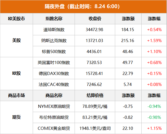 美股:标普500指数收涨48.46点,涨幅1.10%,报4436.01点。道指收涨184.15点,涨幅0.54%,报34472.98点。纳指收涨215.16点,涨幅1.59%,报13721.03点。 欧股:德国DAX 30指数收涨0.15%,报15728.41点。法国CAC 40指数收涨0.08%,报7246.62点。英国富时100指数收涨0.68%,报7320.53点。 亚太股市:8月23日,香港恒生指数收涨0.31%,报17845.92点;恒生科技指数收涨0.2%,报4008.86点;日经225指数收涨0.50%,报32044.50点。韩国KOSPI指数收跌0.41%,报2505.50点。