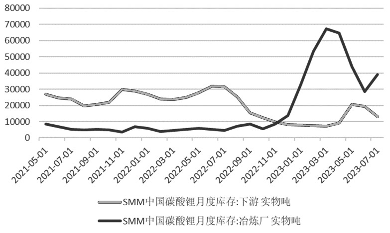 图为碳酸锂月度产能投放情况 [库存更多累积在上游] 数据显示,碳酸锂月度需求量持续下滑,目前需求比较弱。电芯需求不足使得材料厂订单减量,现货市场对后市需求改善的信心不足,现货成交清淡。8月碳酸锂月度需求量为58232.07吨,较上月减少2643吨,环比减少4.34%。8月三元材料产量55017吨,环比减少3.42%,同比减少6.11%;磷酸铁锂月度产量133450吨,环比减少3.9%,同比增长47.5%;钴酸锂月度产量6398吨,环比减少4%,同比增长13%;锰酸锂月度产量7526吨,环比减少25.28%,同比增长31.65%。三元产量有所下滑,产量增速比较平稳,与碳酸锂消费量的增长相对应,终端需求向上传导,正极材料整体生产和订单采购都有所增加,中高镍三元的产量增量相对更大。目前电芯需求较弱,向上传导至材料端订单减量,铁锂有一定减产,储能市场需求稳定提升,整体好于动力电池需求。数码市场和小动力市场需求不及预期,钴酸锂和锰酸锂产量小幅下滑。 从下游终端需求看,目前新能源销售市场数据持续强劲,终端消费数据仍偏乐观,整体未受电芯方面的影响。据乘联会数据,7月中国新能源乘用车批发销量达到73.7万辆,同比增长30.7%,环比下降3.1%,1—7月累计批发427.9万辆,同比增长41.2%;新能源车市场零售64.1万辆,同比增长31.9%,环比下降3.6%,2023年以来累计零售372.5万辆,同比增长36.3%。7月新能源车国内零售渗透率36.1%,较去年同期26.8%的渗透率提升9.3%。 目前碳酸锂整体库存水平相对仍比较高,下游库存确有消化,但电芯需求不足,铁锂厂订单大幅减量,本轮下游刚需补库幅度较低,前期市场期待的短期刚需补库驱动逐步证伪。SMM统计数据显示,7月样本月度总库存为52260吨,其中样本冶炼厂库存为39172吨,样本正极材料厂库存为13088吨。