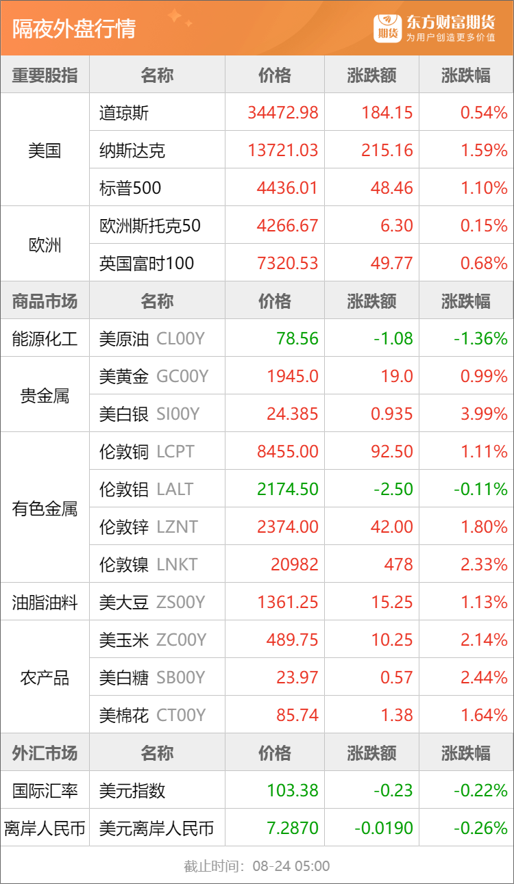 隔夜行情![]() ![]() 每日精选6年新高!消费旺季糖价上冲 印度泰国减产预期成多头支撑 市场信心分化 浮法玻璃未来谨慎乐观 需求最差阶段已过去 机构认为钢铁行业底部或正在到来 宏观产经经济日报:“房住不炒”是促进房地产市场平稳健康发展的一项总原则,不应也不会改变,须长期坚持。房地产是国民经济的支柱产业,这是客观事实。不能夸大其作用,像过去一样对这一行业存在过度依赖的倾向;也不能轻视其在宏观经济中的作用、对上下游产业的带动作用。 国家发改委:8月23日,国家发改委发布消息称,自24时起,国内汽油价格和柴油价格均上调55元/吨。折合升价,92号汽油上调0.04元,95号汽油和0号柴油均上调0.05元。 中国证券报:更大力度布局前瞻性战略性新兴产业,已成为新一轮国企改革深化提升行动的重点任务之一。8月23日,记者了解到,支持央企战略性新兴产业发展的一揽子政策将加快出台。国资委正积极部署央企产业焕新行动和未来产业启航行动,同时,将大力支持“科改企业”“双百企业”布局发展前瞻性战略性新兴产业。 品种资讯黑色系期货 螺纹钢:8月23日,全国250家长、短流程代表钢厂废钢库存总量437.08万吨,较昨日减少0.38万吨,下降0.09%;库存周转天9.3天,较昨日持平;日消耗总量46.34万吨,较昨日增长0.56%;日到货总量45.96万吨,较昨日下降1.64%。 本周,唐山主流样本钢厂平均铁水不含税成本为2759元/吨,平均钢坯含税成本3598元/吨,周环比上调32元/吨,与8月23日当前普方坯出厂价格3550元/吨相比,钢厂平均亏损48元/吨,周环比减少8元/吨。(Mysteel) 重点统计钢铁企业共生产粗钢2214.98万吨、生铁1997.08万吨、钢材2154.99万吨。其中粗钢日产221.50万吨,环比增长2.89%;生铁日产199.71万吨,环比增长1.04%;钢材日产215.50万吨,环比增长5.44%。据此估算,本旬全国日产粗钢298.40万吨、环比增长1.71%,日产生铁254.02万吨、环比增长1.02%,日产钢材376.67万吨,环比增长4.12%。(中钢协) 铁矿石:8月23日铁矿石成交量,全国主港铁矿累计成交99万吨,环比下降27.7%;本周平均每日成交114.3万吨,环比上涨26.3%;本月平均每日成交92.2万吨,环比下降10.1%。(Mysteel) 煤炭:受油价上涨影响,船东成本增加,营运压力加大停航增多,同时港口部分煤种供应趋紧,下游采购积极性有所增加,沿海煤炭运价小幅上涨。(上海航运交易所) 农产品期货 白糖:据路透,三位印度政府消息人士称,由于降雨不足导致甘蔗减产,印度预计将在10月开始的2023/24年度禁止糖厂出口,这将是七年来首次停止出口。印度退出全球市场,可能会推高纽约和伦敦糖价的基准价格,引发对全球食品市场进一步通胀的担忧。(财联社) 生猪:2023年8月14日—20日,全国规模以上生猪定点屠宰企业生猪平均收购价格为17.84元/公斤,较前一周上涨0.4%,较去年同期下降19.3%;白条肉平均出厂价格为23.17元/公斤,较前一周上涨0.3%,较去年同期下降18.5%。 截至8月23日14:00时,全国农产品批发市场猪肉平均价格为22.53元/公斤,较前一日上升0.2%。(农业农村部) 棕榈油:大华继显调查显示,马来西亚8月1-20日棕榈油产量变化幅度为+7%至+11%。其中沙巴产量幅度为+7%至+11%,沙捞越产量幅度为+9%至+13%,马来半岛产量幅度为+6%至+10%。(新华财经) 棉花:8月23日储备棉销售资源12000.1499吨,实际成交12000.1499吨,成交率100%。平均成交价格17409元/吨,较前一日下跌145元/吨,折3128价格17996元/吨,较前一日上涨4元/吨。新疆棉成交均价17502元/吨,较前一日上涨139元/吨,新疆棉折3128价格18173元/吨,较前一日上涨145元/吨,新疆棉平均加价幅度828元/吨。(中国棉花信息网) 有色/贵金属期货 沪铝:华泰证券近日研报指出,预计全年电解铝产量将同比增长3.5%至4150万吨左右。(界面新闻) 有分析人士向财联社记者表示,进入三季度,国内氧化铝市场止跌反弹,电力板块窄幅波动,预计三季度电解铝行业平均成本或有企稳止跌预期,行业维持低成本状态。有电解铝上市公司高管向财联社记者表示,从市场接触中发现近期铝市的信心来自于:在成本端整体走弱和云南电解铝复产放量的同时,铝价依旧“抗跌”。(财联社) 碳酸锂:据上海钢联发布数据显示,今日电池级碳酸锂价格持平,均价报22.0万元/吨。(财联社) 能化期货 原油:据媒体报道,随着俄乌之间紧张局势的加剧,保险公司提高了黑海地区俄罗斯油轮的保费。(财联社) 纯碱:远兴能源8月23日在投资者互动平台表示,一线目前已基本具备达产条件,部分工艺、设备仍需优化调整。现场人员基本可以满足项目建设、生产需要,后续将根据需要及时进行补充。(每日经济新闻) 尿素:国内尿素报价震荡整理运行,部分地区市场价格上调10-30元/吨左右。(农时达情报) 甲醇:华东地区:江苏太仓甲醇市场现货小单参考报盘2455-2460元/吨附近出库现汇,买气一般。常州地区甲醇报盘参考2500元/吨附近,场内可售货源几无,价格为根据周边市场预估价格;国产货源送到周边理论价格或参考2490-2510元/吨附近;张家港地区商谈参考报盘2480元/吨,基差参考+30元/吨附近,交投氛围清淡。宁波地区甲醇主要一手商维持报盘2520-2530元/吨出库现汇,成交一般。(甲醇网) 环球视野国家统计局:2023年,全国早稻总产量566.7亿斤,比2022年增加4.3亿斤,增长0.8%。全国早稻每亩单产399.1公斤,比上年增加4.8公斤,早稻单产小幅增长。 每日经济新闻:北京时间8月25日,一年一度的全球央行年会将在美国怀俄明州杰克逊霍尔举