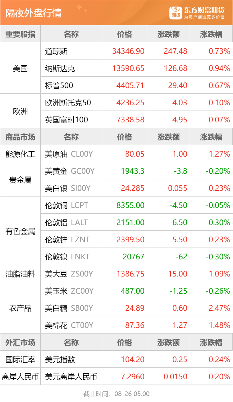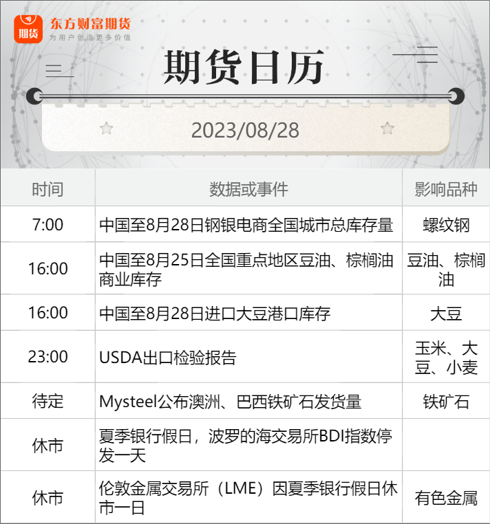 隔夜行情![]() ![]() 每日精选证监会同意注册!烧碱、对二甲苯期货及期权要来了,一文了解现货市场! 事关石化、钢铁、建材、有色!官方连发四份稳增长方案 全球大米价格飙升!世界最大大米出口国又出手了 宏观产经国家统计局:1—7月份,全国规模以上工业企业实现利润总额39439.8亿元,同比下降15.5%,降幅比1—6月份收窄1.3个百分点。1—7月份,规模以上工业企业中,国有控股企业实现利润总额13805.9亿元,同比下降20.3%;股份制企业实现利润总额28835.6亿元,下降16.6%;外商及港澳台商投资企业实现利润总额9355.7亿元,下降12.4%;私营企业实现利润总额10226.6亿元,下降10.7%。 财政部网站:为活跃资本市场、提振投资者信心,自2023年8月28日起,证券交易印花税实施减半征收。 财联社:美联储主席鲍威尔在杰克逊霍尔全球央行年会上表示,将谨慎地决定是否再次加息。在通胀持续放缓之前,将采取限制性政策。鲍威尔表示,如果有必要,美联储随时准备进一步提高利率,因为在降低通胀方面取得的进展虽然令人鼓舞,但还远远没有完成。要恢复价格稳定,还有相当长的路要走。 品种资讯黑色系期货 钢材:8月中旬,21个城市5大品种钢材社会库存963万吨,环比减少1万吨,下降0.1%,库存由升转降;比年初增加211万吨,上升28.1%;比上年同期减少11万吨,下降1.1%。(中钢协) 工业和信息化部原材料工业司司长常国武介绍,1—7月,钢铁行业工业增加值同比增长6.6%,较工业平均水平高2.8个百分点,全国生铁、粗钢、钢材产量分别为5.3亿吨、6.3亿吨和7.9亿吨,同比分别增长3.5%、2.5%和5.4%。(新京报) 民生证券近日研报指出,传统旺季逐步来临,钢材基本面有望改善,持续关注后续需求恢复力度。(界面新闻) 铁矿石:工信部等七部门发布关于印发《钢铁行业稳增长工作方案》的通知。其中提到,提高铁素资源等保障能力。充分发挥国内铁矿开发协调机制作用,加快国内重点铁矿项目开工投产、扩能扩产,确保合规矿企正常生产。鼓励有条件的企业,开展境外铁矿资源合作,特别是推进与周边国家铁矿资源勘查开采合作。开展铁矿石“红黄蓝”供需预警,强化期现货市场监管。(财联社) 煤炭:下游电厂库存高位,整体采购意向较弱。煤价止跌上涨,市场情绪稍有回温,货盘小幅释放,短期内弱势格局仍将持续,沿海煤炭运输价格继续底部波动。(上海航运交易所) 农产品期货 生猪:本周国内生猪价格较为平稳。据中国养猪网的数据,8月25日,生猪(外三元)价格为17.19元/公斤,与上周五(8月18日)的17.26元/公斤相比,下降0.4%。从一周均价来看,本周生猪均价为17.17元/公斤,与上周17.31元/公斤的均价相比,下降0.8%。(澎湃新闻) 玉米:本周,美国农业侦察员发现,由于干旱和授粉不良,美国南达科他州玉米存在果实不饱满的情况,玉米棒子的顶部并未长出饱满的玉米粒。农民们抱怨称,这些玉米好像已经被啃掉一半一样。另一产地俄亥俄州的情况也十分不乐观,侦察员称玉米还未完全成熟,这意味着很容易受到接下来一周热浪的影响。(财联社) 豆油:截至22日,8月大豆平均进口成本为4450元/吨,环比上涨5.65%;一级豆油全国均价8539元/吨,环比上涨2.44%。因原料主要依赖进口大豆,因此豆油价格变化一定程度上受到进口大豆成本的影响。(卓创资讯) 菜粕:本周沿海进口油菜籽压榨企业平均开工负荷率为41.93%,较上周相比提升11.36个百分点。压榨企业开工提升后,国内菜粕现货供应略有增量,利空菜粕价格。不过基于下游水产养殖对于菜粕仍旧存在刚需以及进口菜粕量下滑,总体菜粕现货价格下跌幅度不大。后续压榨企业开工或仍旧高于前期,叠加四季度即将进入水产养殖淡季,预期菜粕价格向上空间或有限。(卓创资讯) 有色/贵金属期货 工业硅:本周工业硅价格整体持稳。现货市场工业硅价格与上周相比变化较小,仅部分牌号和地区的价格上涨100-200元/吨,冶金级主流价格在13000元/吨-141000元/吨,化学级主流价格在14000元/吨-15200元/吨。过去一周(8月17-23日)工业硅2309主力合约收盘价格从13455元/吨小幅上涨1.08%至13600元/吨。(硅业分会) 碳酸锂:今年以来,锂电材料竞争加剧,新能源产业链市场形势面临供求关系急速逆转现象。上海钢联新能源事业部锂业分析师李攀对记者表示,“碳酸锂下半年供给端增量较多,预计碳酸锂价格仍有下行空间,传统的金九银十或许会被打破。”(财联社) 黄金:第三季度,国内金价一如既往表现强劲,与国际金价差价扩大,将是第三季度黄金市场最为显著的特征。截至作者交稿前,国内上海黄金交易所现货实盘合约Au99.99报价已经超过460元/克,比国际现货黄金价格整整高出了10元/克。这种现象的存在将激发黄金市场的更多套利行为,国内金价在第三季度接下来的时间内将面临更多抛压。(中国黄金报) 能化期货 原油:据洲际交易所(ICE),截至8月22日当周,布伦特原油期货投机性净多头头寸减少12964手合约至217771手合约;柴油投机性净多头头寸减少6151手合约至87790手合约。(财联社) 成品油:今天下午,记者从中国石化新闻办获悉,今年上半年,中国石化实现油气当量产量2.50亿桶油当量,同比增长3.3%,其中,天然气产量187亿立方米,同比增长7.6%。对于下半年市场需求,公司董事长马永生表示,预计下半年境内成品油、天然气需求保持增长,化工产品需求逐步复苏。(财联社) 纯碱:郑商所发布关于增设指定纯碱交割仓库的公告,经研究决定,增设衡水市