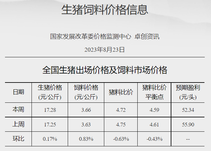 国家发展改革委价格监测中心:猪料比价环比下降 预计猪价上涨空间有限