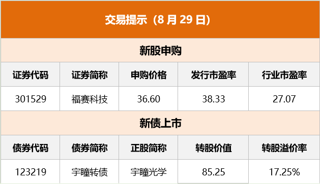 1、新华社:证券交易印花税减半征收,释放鲜明积极政策信号。业内人士指出,7月24日召开的中共中央政治局会议明确提出“要活跃资本市场,提振投资者信心”,对于资本市场的定调更加积极、方向更加明确。本次调降证券交易印花税税率充分体现了中央对活跃资本市场的坚定态度和呵护股市的信心决心,释放了鲜明积极的政策信号。 2、新华社:下一步要加大宏观政策调控力度,积极扩大国内需求。国家发改委主任郑栅洁在十四届全国人大常委会第五次会议第一次全体会议上作关于今年以来国民经济和社会发展计划执行情况的报告。报告指出,下一步要加大宏观政策调控力度,积极扩大国内需求,大力推动现代化产业体系建设;因城施策用好政策工具箱,优化供地结构,更好满足居民刚性和改善性住房需求,促进房地产市场平稳健康发展。 3、财政部、税务总局:发布关于延续实施全年一次性奖金个人所得税政策的公告。居民个人取得全年一次性奖金,符合《国家税务总局关于调整个人取得全年一次性奖金等计算征收个人所得税方法问题的通知》(国税发〔2005〕9号)规定的,不并入当年综合所得,以全年一次性奖金收入除以12个月得到的数额,按照本公告所附按月换算后的综合所得税率表,确定适用税率和速算扣除数,单独计算纳税。 4、新华社:公司法修订草案三审稿提请十四届全国人大常委会第五次会议审议。为进一步落实产权平等保护要求,草案三审稿进一步完善中小股东权利保护相关规定,规定控股股东滥用股东权利,严重损害公司或者其他股东利益的,其他股东有权请求公司按照合理的价格收购其股权。 5、财联社:在部分券商暂停量化T0算法交易后,有技术提供商下发通知称,“由于全天市场流动性释放相对充分,8月29日恢复增强行情和算法服务。”对此,业内人士表示,多家券商暂停网格交易中的T0算法交易,属于对监管新要求的风控举措,目前在调整和测试策略。