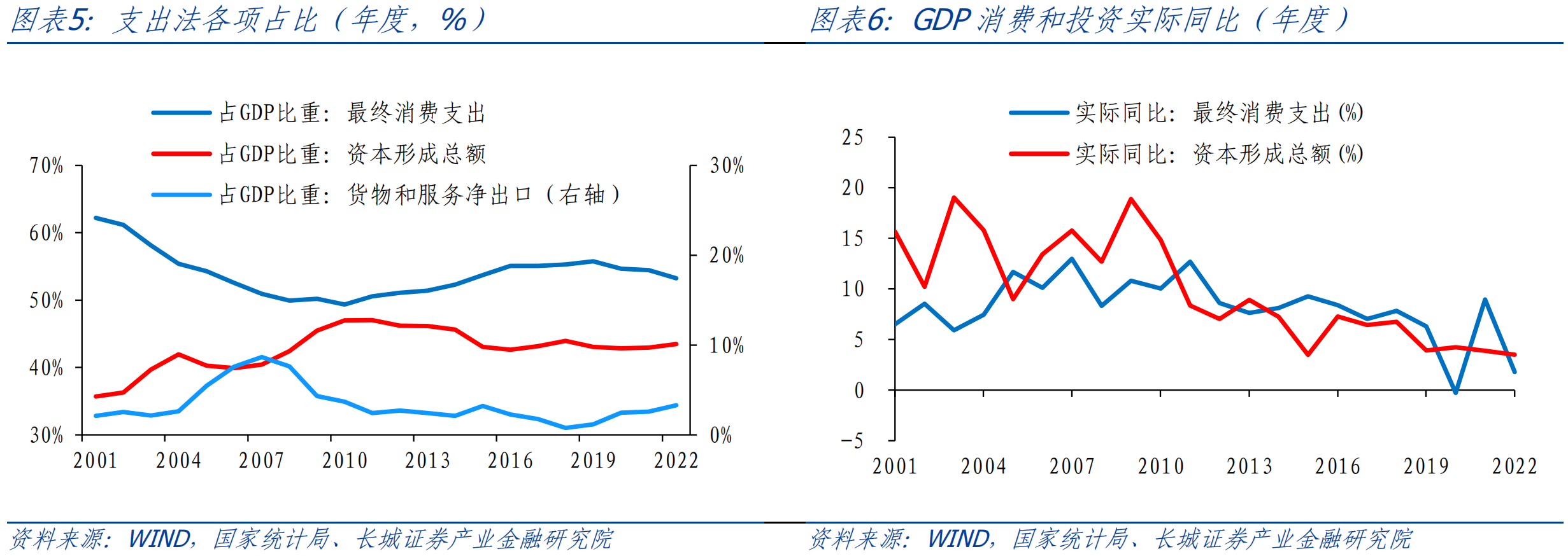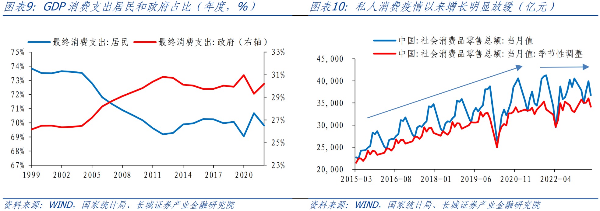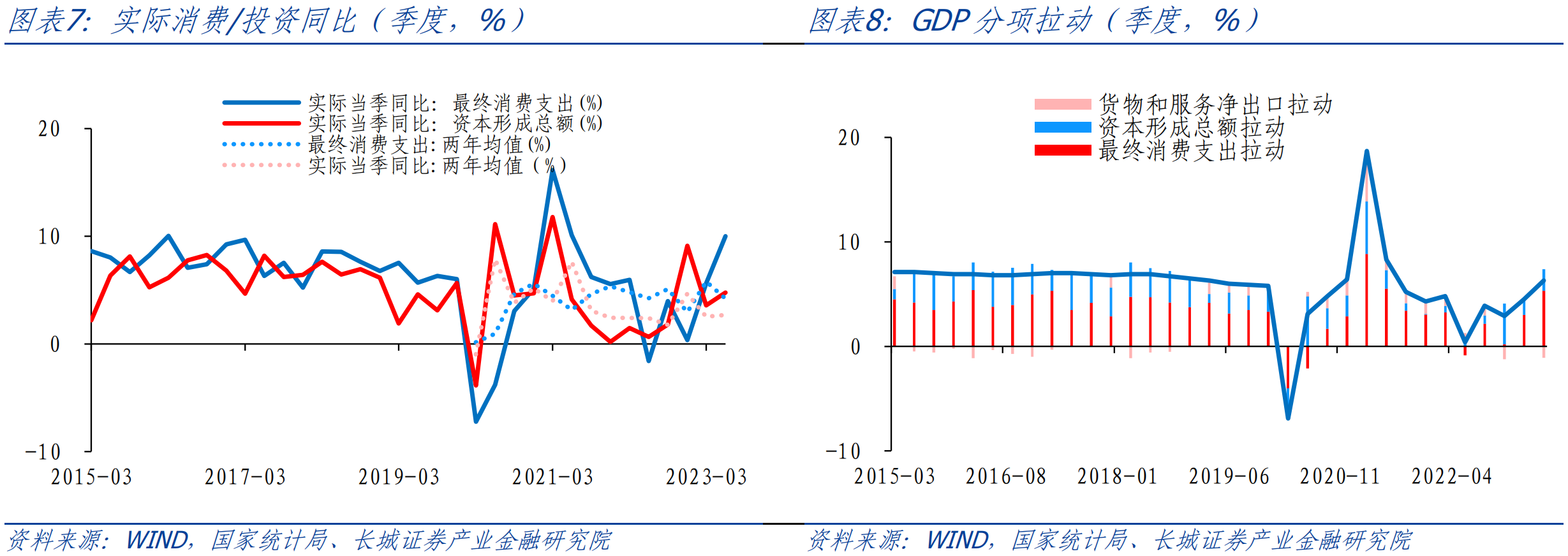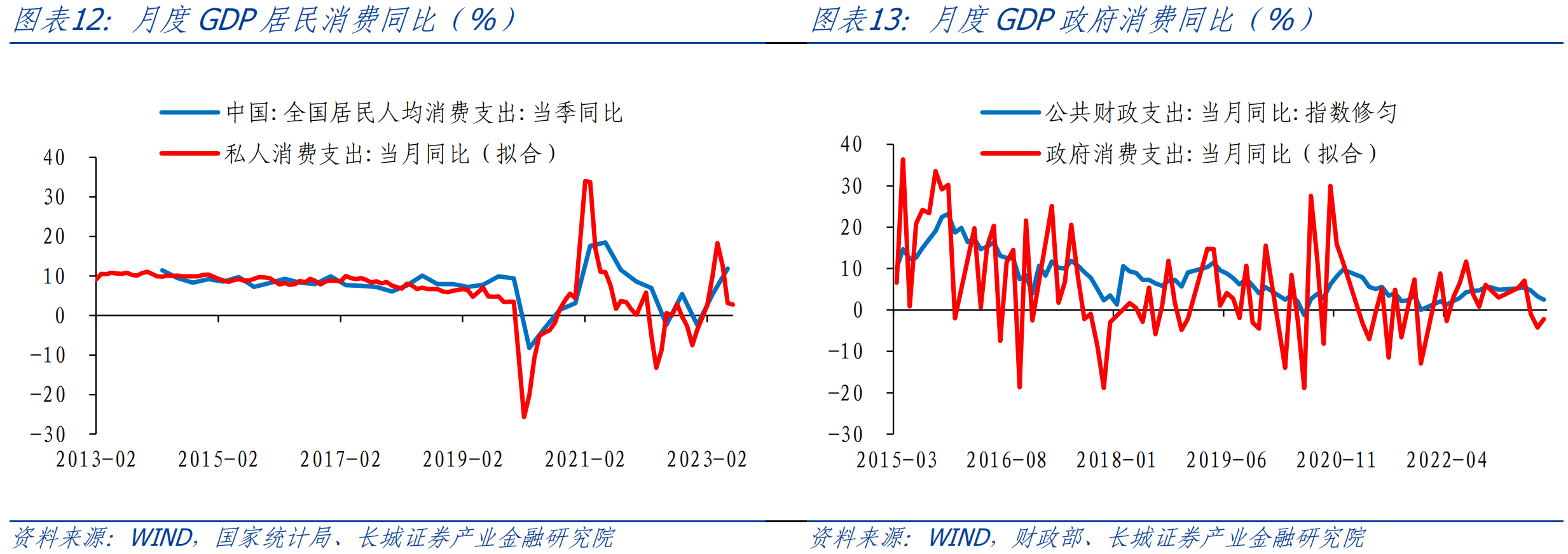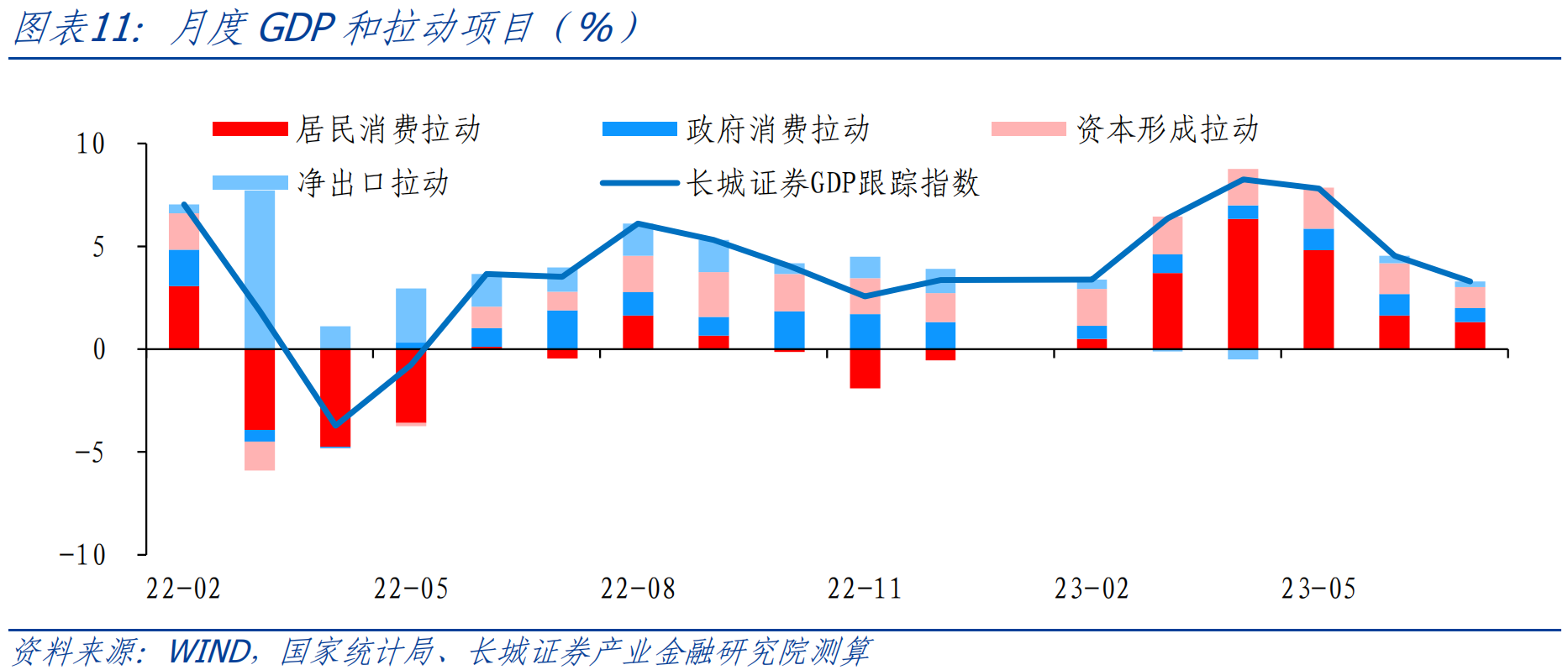 ![]() 今年上半年,与疫情以来的特征一样,消费偏弱,投资提供一定支撑。消费支出低基数因素下,消费支出增速重新回升,实际同比8%,拉动GDP回升4.3个百分点,而资本形成总额实际同比增长4.3%,拉动GDP增长1.9个百分点。但也要看到二季度,消费支出当季同比增长10%,对应两年均值为4.2%,相比于一季度的两年均值5.8%,以及疫情前的7%明显放缓。同时,二季度资本形成总额实际同比增长4.8%,对应两年均值为2.7%,略高于一季度的2.5%,显示出投资还有一定的支撑。 ![]() 进一步看GDP消费支出,可以拆分为居民端和政府端,2004年至今,居民消费占比整体回落,政府消费的支撑作用显现。居民消费与政府消费支出常年维持在7:3附近,受疫情冲击较重的2020、2022年居民消费占比分别低至69%和69.8%,政府支出在这两年起到了明显的“兜底”作用。 ![]() 2.2 月度GDP解构 我们在《如何估算支出法各分项对月度GDP的拉动? ——长城证券GDP跟踪指数系列(二)》报告中已经详细介绍过GDP各个分项月度指标大致拟合方法。进入三季度,根据统计局公布的数据和我们跟踪的高频数据,我们测算7月份GDP资本形成额、居民消费、政府消费分别同比1.7%、2.8%和2.4%,拉动7月GDP增长1.0、1.3和0.7个百分点。为了剔除基数影响,我们从增速两年均值来看,7月份GDP资本形成额、居民消费、政府消费同比两年均值分别为1.9%、0.8%和7.1%,与6月相比资本投资与居民消费都在放缓,只有政府消费有所回升。