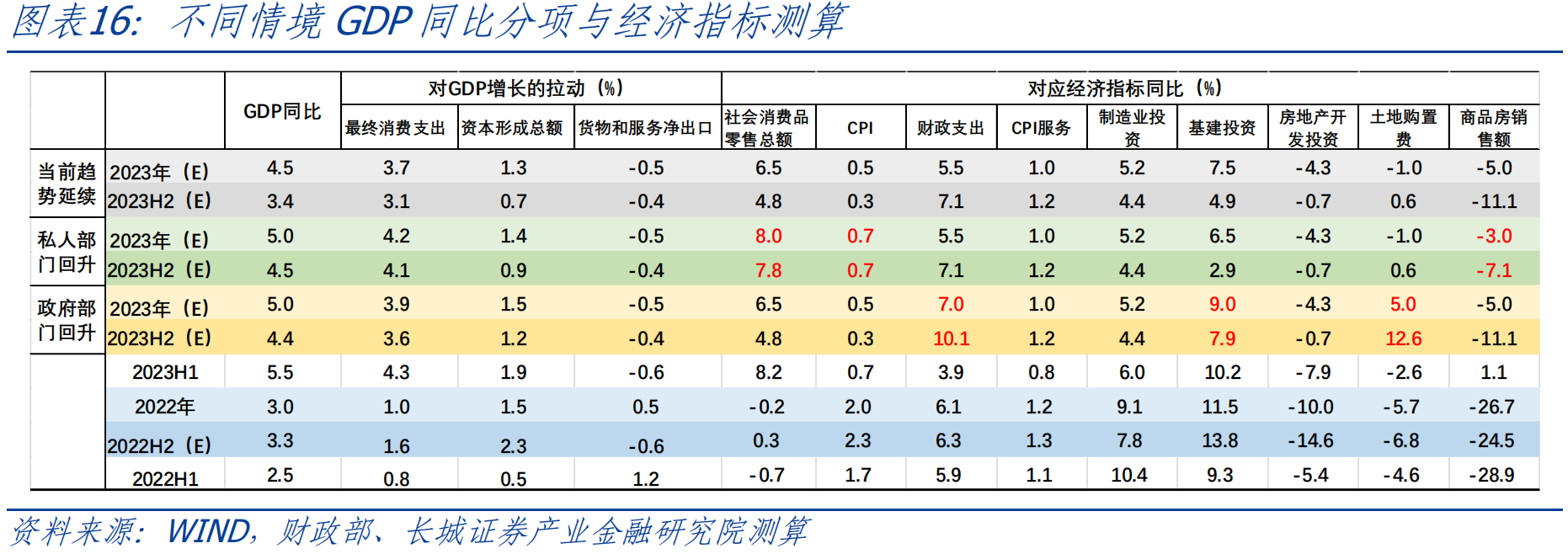 ![]() 3. 后续政策:如何分配私人部门和政府部门对GDP的拉动作用? 如前文所述,上半年GDP同比增长5.5%,要完成全年5%的GDP增速,下半年GDP同比要达到4.5%左右。但二季度以来,经济增长动能走弱,一直到7月,GDP同比两年均值仅3.4%。如果这种弱势在下半年延续,那么全年GDP同比可能仅为4.5%左右。我们从《下半年经济展望》对关键经济指标的预测值出发,大致测算消费支出、资本形成总额、货物和服务净出口分别对GDP拉动3.7、1.3和-0.5个百分点,对应的关键经济指标如下表列示。 今年出口偏弱,货物和服务净出口大概率对GDP形成拖累。2022年,货物和服务净出口拉动我国GDP同比增长0.5个百分点,而今年出口偏弱,我们在《下半年经济展望》中大致预计全年出口总额同比下降5%,按此大致推算,全年净出口拖累GDP下滑约0.5个百分点。 因此,在外需收缩、出口下行压力下,扩内需成为支撑GDP的重要手段,消费支出和资本形成额全年合计应拉动GDP增长5.5个百分点,其中下半年资本形成总额和消费支出合计需要拉动GDP增长约4.9个百分点。那么下面我们进一步讨论如何分配私人部门和政府部门对GDP的拉动作用。