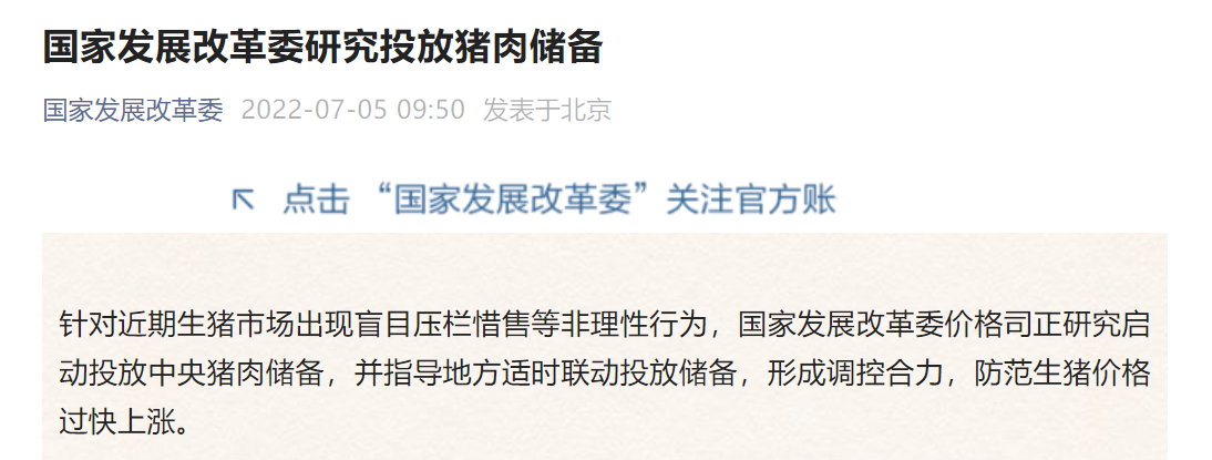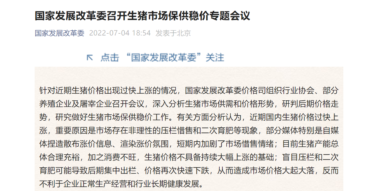 | 7月4日,A股猪肉股集体大涨,多股涨停。在期货市场,午后生猪主连一度涨停,最高达22755元/吨,创今年以来新高,日内涨幅7.71%。据央广网报道援引机构统计,截止到7月4日,全国生猪均价已经突破每公斤21元。不到半个月时间,涨幅超过20%。 据国家发展改革委公众号最新消息,针对肉价连涨,国家发改委近期2天3次出手,保障生猪市场平稳运行。 国家发展改革委研究投放猪肉储备![]() 国家发改委7月5日消息,针对近期生猪市场出现盲目压栏惜售等非理性行为,国家发展改革委价格司正研究启动投放中央猪肉储备,并指导地方适时联动投放储备,形成调控合力,防范生猪价格过快上涨。 国家发展改革委价格司与大连商品交易所研究共同做好生猪市场保供稳价等工作 ![]() 据国家发改委7月5日消息,近日,国家发展改革委价格司与大连商品交易所召开座谈会,研究加强沟通协作,共同做好生猪市场保供稳价等工作。 会议指出,我国是全球最大的猪肉生产国和消费国,猪肉价格变化直接关系群众消费支出,保持生猪和猪肉市场平稳运行、价格水平在合理区间,对于稳定群众猪肉消费支出、促进行业长期健康发展,以及保持物价总水平基本稳定都具有重要意义。近期在生猪产能总体合理充裕、猪肉消费不旺的情况下,生猪价格出现过快上涨,各方普遍认为存在过度压栏和二次育肥等非理性行为。 会议商定,国家发展改革委价格司与大连商品交易所紧密合作,会同有关方面进一步完善工作机制、形成工作合力,加强现货期货市场联动监管,及时排查异常交易,强化穿透式监管,依法严厉打击捏造散布涨价信息、囤积居奇、哄抬价格以及资本恶意炒作等违法违规行为,切实保障生猪市场平稳运行。 会议还研究了做好铁矿石等大宗商品保供稳价、加强期货市场建设等相关工作。 国家发展改革委召开生猪市场保供稳价专题会议![]() 7月4日,针对近期生猪价格出现过快上涨的情况,国家发展改革委价格司组织行业协会、部分养殖企业及屠宰企业召开会议,深入分析生猪市场供需和价格形势,研判后期价格走势,研究做好生猪市场保供稳价工作。有关方面分析认为,近期国内生猪价格过快上涨,重要原因是市场存在非理性的压栏惜售和二次育肥等现象,部分媒体特别是自媒体捏造散布涨价信息、渲染涨价氛围,短期内加剧了市场惜售情绪;目前生猪产能总体合理充裕,加之消费不旺,生猪价格不具备持续大幅上涨的基础;盲目压栏和二次育肥可能导致后期集中出栏、价格再次快速下跌,从而造成市场价格大起大落,反而不利于企业正常生产经营和行业长期健康发展。 参会代表一致表示,将加强行业自律,带头做好生猪市场保供稳价工作,保持正常出栏节奏、不压栏囤货;同时建议国家采取积极措施引导市场理性交易,适时投放猪肉储备给市场“降温”,并加强市场监管,特别是严厉打击故意渲染涨价氛围、制造恐慌情绪的行为。 会上,国家发展改革委价格司表示,国家一直高度关注生猪猪肉市场价格变化,努力防范价格大幅波动,维护市场平稳运行;要求大型养殖企业带头保持正常出栏节奏、顺势出栏适重育肥生猪,不盲目压栏,提醒企业不得囤积居奇、哄抬价格,不得串通涨价;明确表示将适时采取储备调节、供需调节等有效措施,防范生猪价格过快上涨,并会同有关部门加强市场监管,严厉惩处捏造散布涨价信息、哄抬价格等违法违规行为,维护正常市场秩序,促进行业长期健康发展。 业内:目前没有支撑猪价上涨的因素据农业农村部监测,7月4日“农产品批发价格200指数”为116.93,比上周五上升1.08个点,“菜篮子”产品批发价格指数为116.94,比上周五上升1.27个点。截至今日14时,全国农产品批发市场猪肉平均价格为25.74元/公斤,比上周五上升4.8%。 “这几天卖猪就像是卖股票,即使卖不到最高点,也不会卖在最低点。”7月4日晚间,河南养殖户肖先生在接受《每日经济新闻》记者电话采访时称,现在猪肉价格虽然都在涨,但养猪户一直捂着不卖,生怕卖少了,6月20日还只卖8.5元/斤,现在涨到12元/斤,都在“赌”猪价还会上涨。肖先生认为,一方面消费没上来,另一方面饲料、兽药、疫苗都涨得不多,如今猪价大涨是不正常的。 生意社生猪产品分析师李文旭7月4日在接受记者电话采访时也表示,此次猪价快速上涨并不是猪周期的因素,而是有企业压栏惜售,散养殖户也“添了一把火”,越是涨价越是不卖,助推了价格上涨。 “毕竟没有实质利好支撑猪价上涨,目前学校放假,消费主力退场,生猪和能繁母猪数量都是平稳的,更没有出现非洲猪瘟导致扑杀,什么能支撑猪价上涨?” 李文旭还表示,国家有关部门希望看到的是猪价稳步上涨,养殖户的利润稳步回升,而不是大起大落、大幅波动。此次会议后,随着压栏放开,供应增加,肯定有部分地区会逐渐下调猪价。而随着市场供需、成本、养殖户利润等因素综合作用,猪价会回落到合理区间,大约在19元/千克。 (文章来源:每日经济新闻) (责任编辑:admin) |