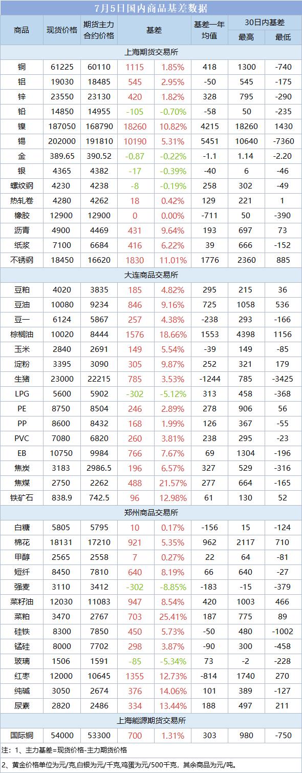 基差报告:7月5日国内商品基差数据一览