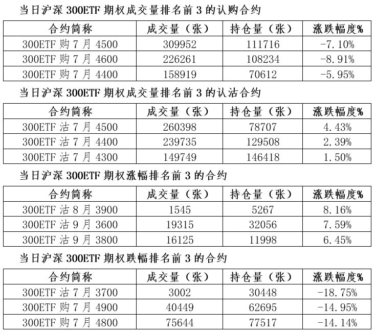 7月5日上证50ETF现货报收于3.063元,上涨0.00%,上证50ETF期权总成交面额703.255亿元,期现成交比为0.19,权利金成交金额13.547亿元;合约总成交2304535张,较上一交易日增加35.22%,总持仓2603321张,较上一交易日增加2.18%。认沽认购比为0.76(上一交易日认沽认购比0.88)。 沪深300ETF现货报收于4.511元,下跌0.22%,沪深300ETF期权总成交面额1075.559亿元,期现成交比为0.30,权利金成交金额20.350亿元;合约总成交2409653张,较上一交易日增加44.37%,总持仓2200472张,较上一交易日增加2.56%。认沽认购比为0.91(上一交易日认沽认购比0.86)。