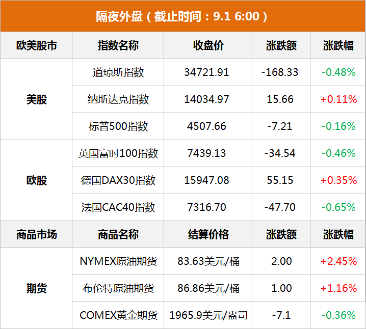 美股:道指收跌0.48%,报34721.91点;纳指收涨0.11%,报14034.97点;标普500指数收跌0.16%,报4507.66点。 欧股:德国DAX 30指数收涨0.35%,报15947.08点。法国CAC 40指数收跌0.65%,报7316.70点。英国富时100指数收跌0.46%,报7439.13点。 亚太股市:8月31日,香港恒生指数收跌0.55%,报18382.06点;恒生科技指数收跌0.38%,报4179.49点。日经225指数收涨0.74%,报32592.50点。韩国KOSPI指数收跌0.19%,报2556.27点。 财联社:俄罗斯副总理诺瓦克对该国总统普京表示,俄罗斯与OPEC+就进一步缩减石油出口达成一致,将于下周宣布相关措施。诺瓦克本周早些时候表示,俄罗斯正与其OPEC+伙伴国讨论将减少石油出口延长到10月的可能性。该国已经承诺9月将每日出口量减少30万桶。 美国能源部长格兰霍姆:美国将为汽车制造商和供应商提供高达120亿美元的资金,用于改造生产电动汽车的设施;美国将提供35亿美元用于支持国内电池制造;不清楚这笔资金是否会对美国汽车工人联合会的集体谈判产生影响。 欧洲央行:7月货币政策会议纪要显示,所有成员支持将利率上调25个基点。如果没有令人信服的证据表明累积政策紧缩的效果足够强大,9月份进一步加息将是必要的。