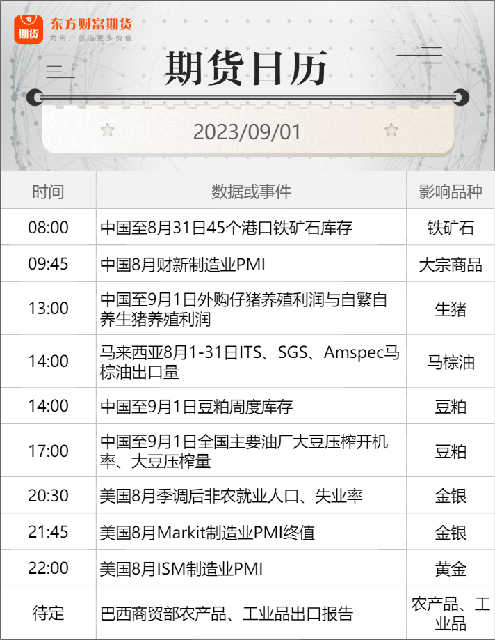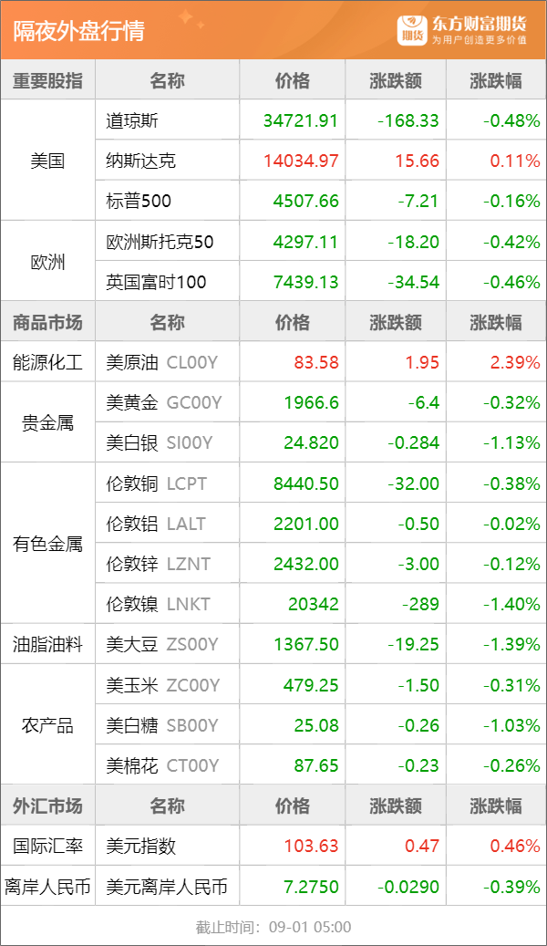 隔夜行情![]() ![]() 每日精选央行、金融监管总局:降低存量首套住房贷款利率 中钢协:前七个月粗钢表观消费量同比略降0.5%,今年钢铁生产总量不高于去年水平是合理的选择 印度8月降雨量创下百年来最低纪录,恐将对农作物实施更多出口限制 宏观产经央行、金融监管总局:发布关于降低存量首套住房贷款利率有关事项的通知。自2023年9月25日起,存量首套住房商业性个人住房贷款的借款人可向承贷金融机构提出申请,由该金融机构新发放贷款置换存量首套住房商业性个人住房贷款。 央行、金融监管总局:发布关于调整优化差别化住房信贷政策的通知。对于贷款购买商品住房的居民家庭,首套住房商业性个人住房贷款最低首付款比例统一为不低于20%,二套住房商业性个人住房贷款最低首付款比例统一为不低于30%。首套住房商业性个人住房贷款利率政策下限按现行规定执行,二套住房商业性个人住房贷款利率政策下限调整为不低于相应期限贷款市场报价利率加20个基点。 中国政府网:国务院发布关于提高个人所得税有关专项附加扣除标准的通知。3岁以下婴幼儿照护专项附加扣除标准,由每个婴幼儿每月1000元提高到2000元。子女教育专项附加扣除标准,由每个子女每月1000元提高到2000元。赡养老人专项附加扣除标准,由每月2000元提高到3000元。其中,独生子女按照每月3000元的标准定额扣除;非独生子女与兄弟姐妹分摊每月3000元的扣除额度,每人分摊的额度不能超过每月1500元。 品种资讯黑色系期货 螺纹钢:在宝钢股份2023年中期业绩会上,宝钢股份董事长邹继新表示:展望钢铁市场,现在整体需求还是偏弱,供给的压力非常大,短期内没有好转的迹象。预计今年总的粗钢产量和去年持平或略有下降。(第一财经) 截至8月31日当周,产量连续六周减少,厂库、社库连续第三周减少,表需由增转降。螺纹产量258.73万吨,较上周减少4.72万吨,降幅为1.79%;螺纹厂库195.88万吨,较上周减少1.05万吨,降幅为0.53%。(Mysteel) 焦煤:截至8月31日当周,全国平均吨焦盈利13元/吨;山西准一级焦平均盈利52元/吨,山东准一级焦平均盈利11元/吨,内蒙二级焦平均盈利-36元/吨,河北准一级焦平均盈利29元/吨。(Mysteel) 硅铁:9月河钢75B硅铁招标数量2516吨,8月招标数量2600吨,较8月减少84吨。(Mysteel) 农产品期货 玉米:据美国农业部(USDA)最新干旱报告显示,截至8月29日当周,约45%的美国玉米种植区域受到干旱影响,而此前一周为43%,去年同期为28%;约37%的美国棉花种植区域受到干旱影响,而此前一周为32%,去年同期为47%。(新华财经) 大豆:据美国农业部(USDA)最新干旱报告显示,截至8月29日当周,约40%的美国大豆种植区域受到干旱影响,而此前一周为38%,去年同期为21%。(新华财经) 农业农村部表示,下一步,农业农村部将会同有关部门,加快实施全国粮油等主要作物大面积单产提升行动,增强粮食和重要农产品稳定安全供给能力。在大豆重点县、玉米重点县整建制开展主推技术示范,推动大面积均衡增产尽快见效。(财联社) 棕榈油:印尼将9月1日至15日的毛棕榈油参考价格设定为每吨805.20美元。(新华财经) 据船运调查机构ITS数据显示,马来西亚8月1-31日棕榈油出口量为1201488吨,7月1-31日数据为1238438吨,环比减少2.98%。(新华财经) 白糖:中秋和国庆节日备货效应提振下游含糖食品采购需求,白糖市场成交好转,糖厂库存继续下降,且低于历史同期水平,预计8月底全国食糖工业库存降至百万吨以下,9月糖价或继续维持高位运行。(卓创资讯) 有色/贵金属期货 有色:8月31日,伦敦金属交易所(LME)铜库存102900吨,增加3675吨;铝库存515750吨,减少1625吨;镍库存37194吨,减少12吨。锌库存153975吨,增加6100吨;铅库存55100吨,增加425吨;锡库存6370吨,增加165吨。(新华财经) 碳酸锂:据上海钢联发布数据显示,8月31日电池级碳酸锂跌3000元/吨,均价报20.95万元/吨。(财联社) 铜:8月31日,上海有色网铜现货平均成交升贴水较前一交易日上涨10元,至上水325元/吨;月末最后一个交易日现货市场交投冷清,广东现货库存结束“十连降”。(新华财经) 能化期货 原油:欧佩克8月份的石油产量比7月份增加了22万桶/日,达到了2756万桶/日,主要是由伊朗的产量增加所推动。伊朗石油产量达到310万桶/日,为2018年以来最高水平。(财联社) 燃料油:新加坡企业发展局(ESG)数据显示,截至8月30日,新加坡燃料油库存在当周内下降218.4万桶,降至1991.5万桶的6周低点。(新华财经) 纸浆:受欧盟对俄罗斯制裁影响,俄方原材料、木材和纸浆交付受到限制,导致造纸的原材料供应越来越困难。当下,欧洲国家纸张、文具等学习用品价格大幅上涨。(财联社) 玻璃:截至2023年8月31日,全国浮法玻璃日产量为17万吨,环比增加0.47%;开工率为80.98%,环比持平;产能利用率为83.14%,环比增加0.39%。(隆众资讯) 纯碱:截至8月31日,本周国内纯碱厂家总库存14.13万吨,环比下降0.47万吨,下降3.22%。(隆众资讯) 环球视野财联社:美国上周首次申领失业救济人数为22.8万人,预估为23.5万人,前值为23万人。 财联社:俄罗斯副总理诺瓦克对该国总统普京表示,俄罗斯与OPEC+就进一步缩减石油出口达成一致,将于下周宣布相关措施。诺瓦克本周早些时候表示,俄罗斯正与其OPEC+伙伴国讨论将减少石油出口延长到10月的可能性。该国已经承诺9月将每日出口量减少30万桶。 美国能源部长格兰霍姆:美国将为汽车制造商和供应商提供高达120亿美元的资金,