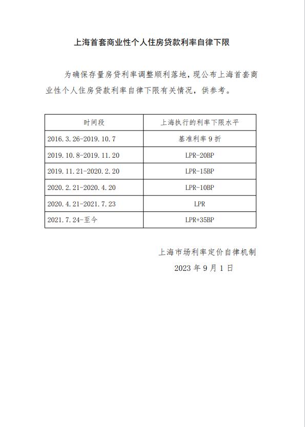 央行上海总部公布上海首套商业性个人住房贷款利率自律下限 央行网站 09月01日 央行上海总部为确保存量房贷利率调整顺利落地,现公布上海首套商业性个人住房贷款利率自律下限有关情况;其中2021.7.24-至今上海执行的利率下限水平为LPR+35BP。(文章来源:央行网站) (责任编辑:admin)