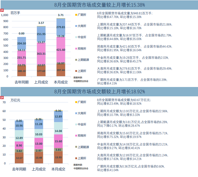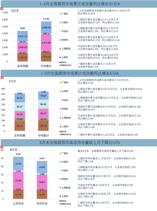 中国期货业协会最新统计资料表明,以单边计算,8月全国期货交易市场成交量为948,807,709手,成交额为606,665.86亿元,同比分别增长47.76%和23.49%,环比分别增长15.38%和18.92%。1-8月全国期货市场累计成交量为5,721,989,397手,累计成交额为3,738,080.24亿元,同比分别增长30.82%和4.55%。 数据显示,今年8月份我国期货市场成交量和成交额环比保持增长态势,并延续7月份以来的良好势头,相比7月分别增长15.38%和18.92%,主要体现在能源化工、有色贵金属、黑色建材、生鲜软商品和饲料养殖这五大板块的活跃品种上。8月份我国制造业PMI继续上行,综合PMI反弹,经济环比扩张态势略有加速,需求带动供给加速上升,原材料和产成品库存同时改善。受政策利好推动,8月份我国证券市场交易活跃,中金所的金融期货与期权品种均出现成交量环比大幅增长,股指期货四个品种环比增幅均超过37%。 截至八月底,今年我国全市场成交量十强期货品种分别是纯碱、PTA、螺纹钢、甲醇、玻璃、豆粕、聚氯乙烯、燃料油、白银和棕榈油期货;全市场成交额十强期货品种分别是沪深300股指、纯碱、原油、黄金、螺纹钢、白银、中证500股指、10年期国债、2年期国债和铁矿石期货;全市场持仓量十强期货品种分别是螺纹钢、豆粕、PTA、甲醇、纯碱、玻璃、热轧卷板、玉米、铁矿石和菜籽粕期货。 ![]() ![]() 具体来看,上海期货交易所8月成交量为207,438,839手,成交额为139,276.13亿元,分别占全国市场的21.86%和22.96%,同比分别增长15.18%和10.79%,环比分别增长16.78%和3.33%。8月末上海期货交易所持仓总量为11,352,291手,较上月末下降1.83%。1-8月上海期货交易所累计成交量为1,374,432,163手,累计成交额为1,003,386.03亿元,同比分别增长15.26%和4.38%,分别占全国市场的24.02%和26.84%。 上海国际能源交易中心8月成交量为16,965,736手,成交额为38,117.41亿元,分别占全国市场的1.79%和6.28%,同比分别增长44.88%和下降0.17%,环比分别增长35.00%和28.47%。8月末上海国际能源交易中心持仓总量为508,843手,较上月增长1.17%。1-8月上海国际能源交易中心累计成交量为90,170,659手,累计成交额为207,388.68亿元,同比分别增长11.02%和下降30.42%,分别占全国市场的1.58%和5.55%。 郑州商品交易所8月成交量为421,598,689手,成交额为155,972.09亿元,分别占全国市场的44.43%和25.71%,同比分别增长81.95%和75.32%,环比分别增长16.04%和19.97%。8月末郑州商品交易所持仓总量为18,005,433手,较上月末下降16.62%。1-8月郑州商品交易所累计成交量为2,471,887,568手,累计成交额为903,743.63亿元,同比分别增长65.34%和44.01%,分别占全国市场的43.20%和24.18%。 大连商品交易所8月成交量为279,812,492手,成交额为128,868.25亿元,分别占全国市场的29.49%和21.24%,同比分别增长36.83%和17.63%,环比分别增长11.06%和14.21%。8月末大连商品交易所持仓总量为14,956,772手,较上月末下降9.29%。1-8月大连商品交易所累计成交量为1,660,035,815手,累计成交额为746,669.30亿元,同比分别增长9.85%和下降12.64%,分别占全国市场的29.01%和19.97%。 中国金融期货交易所8月成交量为19,277,154手,成交额为140,795.82亿元,分别占全国市场的2.03%和23.21%,同比分别增长36.60%和9.27%,环比分别增长45.27%和40.41%。8月末中国金融期货交易所持仓总量为1,799,324手,较上月末增长7.42%。1-8月中国金融期货交易所累计成交量为108,161,681手,累计成交额为864,094.14亿元,同比分别增长14.80%和3.64%,分别占全国市场的1.89%和23.12%。 广州期货交易所8月成交量为3,714,799手,成交额为3,636.15亿元,分别占全国市场的0.39%和0.60%,环比分别增长4.15%和41.04%。8月末广州期货交易所持仓总量为242,514手,较上月末下降5.73%。1-8月广州期货交易所累计成交量为17,301,511手,累计成交额为12,798.45亿元,分别占全国市场的0.30%和0.34%。 (文章来源:新华财经) (责任编辑:admin) |