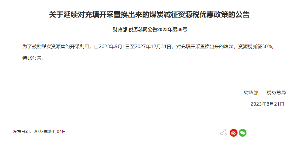 两部门:延续对充填开采置换出来的煤炭减征资源税优惠政策 界面新闻 09月04日 财政部网站9月4日消息,财政部、税务总局发布公告,为了鼓励煤炭资源集约开采利用,自2023年9月1日至2027年12月31日,对充填开采置换出来的煤炭,资源税减征50%。 (文章来源:界面新闻) (责任编辑:admin)