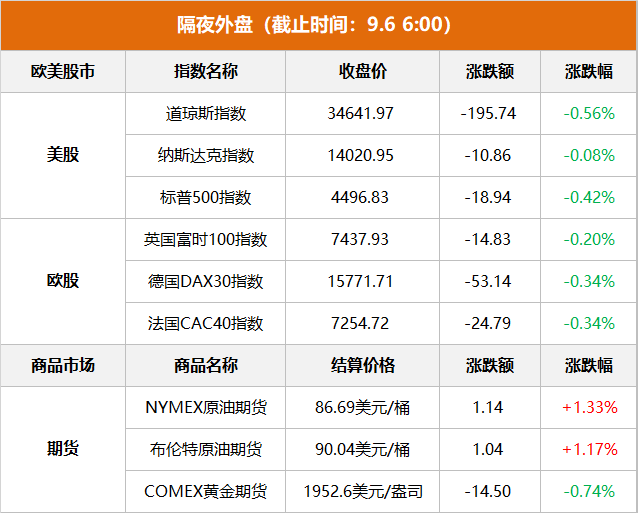 美股:标普500指数收跌18.94点,跌幅0.42%,报4496.83点。道指收跌195.74点,跌幅0.56%,报34641.97点。纳指收跌10.86点,跌幅0.08%,报14020.95点。 欧股:德国DAX 30指数收跌0.34%,报15771.71点。法国CAC 40指数收跌0.34%,报7254.72点。英国富时100指数收跌0.20%,报7437.93点。 亚太股市:9月5日,香港恒生指数收跌2.06%,报18456.91点;恒生科技指数收跌2.59%,报4193.45点。日经225指数收涨0.27%,报32989.50点。韩国KOSPI指数收跌0.09%,报2582.18点。 瑞银集团:随着价格更实惠、生产成本更低的中国电动汽车势不可挡地崛起,西方汽车制造商的全球市场份额将失去五分之一。预计到2030年,以比亚迪为首的中国汽车制造商的全球市场份额将增加近一倍,达到33%。到2030年,西方汽车制造商的全球市场份额将从81%下滑至58%。 财联社:巴西纸浆工业领域最具竞争力的企业之一埃尔多拉多公司,在对华出口纸浆时首次使用人民币作为贸易结算货币。公司首席财务官费尔南多斯表示,本次用人民币结算是一种全新的尝试。金砖国家组织成员大力推动在跨境贸易中使用本币结算,减少对美元的依赖。 日本财务省:公布政府各部门2024财年预算申请金额,一般会计总额达114.3852万亿日元,金额创历史新高。其中,日本防卫省提交的2024财年预算申请超过7.7万亿日元,为历史最高。