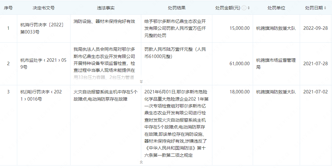 据新华社报道,记者7日从内蒙古自治区鄂尔多斯市应急管理等多个部门获悉,当日杭锦旗一企业发生高压气体喷出事故,截至21时,事故致9人死亡、3人受伤。 据悉,7日15时40分许,杭锦旗独贵塔拉工业园区亿鼎生态农业开发公司(简称亿鼎生态)气化车间发生高压气体喷出事故,导致现场多名在高处作业的工作人员被喷射坠落。事故造成8人当场死亡,4人受伤,其中1名伤员在救治过程中死亡。 事故发生后,鄂尔多斯市、杭锦旗两级应急管理、消防、医疗等救援人员第一时间赶到事故现场展开救援工作。内蒙古自治区政府相关领导第一时间对属地政府和部门进行调度,并率内蒙古自治区应急管理厅、消防救援总队、卫健委等部门主要领导赶赴现场指导救援。目前当地正对伤员进行全力救治,事故原因正在调查中。 企查查显示,涉事公司曾多次因存在安全隐患被行政处罚。 ![]() 另外,该企业为A股上市公司亿利洁能(SH:600277)的控股子公司,亿利洁能持股比例为60%。 ![]() ![]() 亿利洁能2023年半年报显示,亿鼎生态主营肥料生产销售,总资产38.26亿元,净资产22.12亿元,上半年营收11.05亿元,净利润2600万元。 ![]() 截至6月底,亿利洁能总资产349.43亿元,净资产170.43亿元。今年上半年,亿利洁能实现营业收入50.78亿元,同比下降25%;净利润5744.74万元,同比下降90%。 亿利洁能表示,业绩下滑主要是受化工市场环境影响,集团化工产品销售价格同比下降变动幅度高于原材料变动幅度导致净利润减少所致。 (文章来源:证券时报) (责任编辑:admin) |