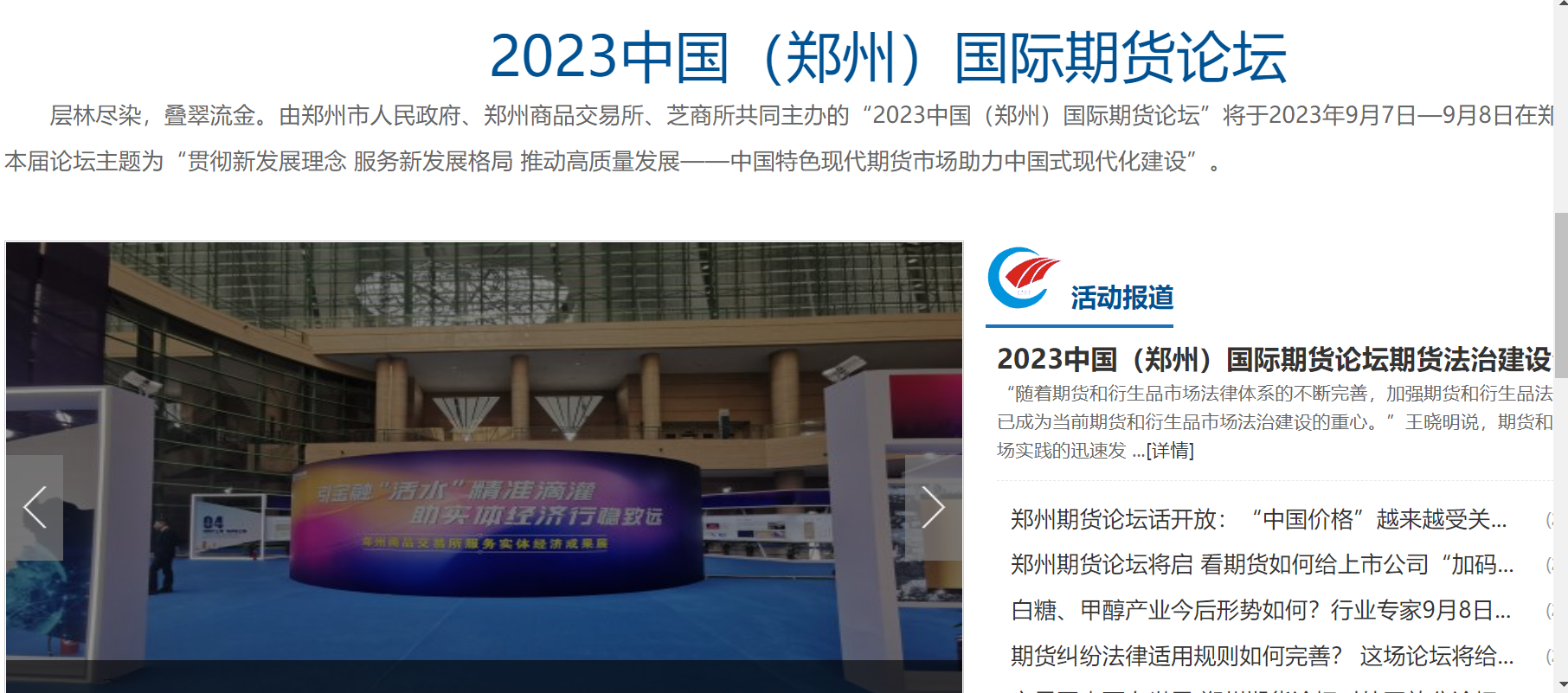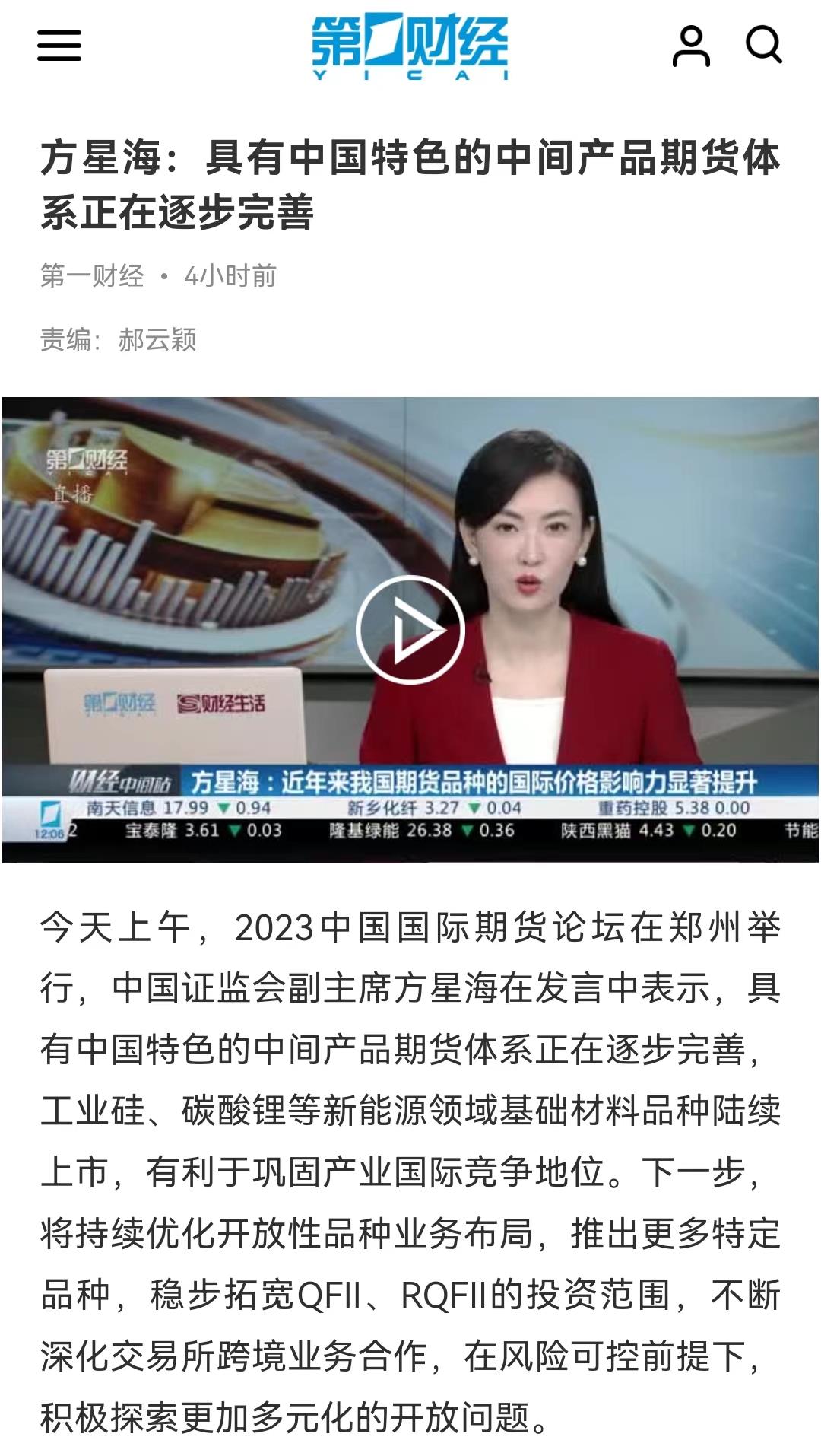 2023中国(郑州)国际期货论坛成功举行!我国期市国际影响力显著提升,引央媒关注! 崔利华 09月08日 期货日报网讯 由郑州市人民政府、郑州商品交易所、芝商所主办,郑东新区管委会、郑州市金融工作局、期货日报承办的2023中国(郑州)国际期货论坛,9月7—8日在郑州成功举行。论坛吸引了央视等中央媒体、国内主流媒体的高度关注。央视新闻以《证监会 我国期市国际影响力显著提升》为题进行报道:第一财经进行视频报道:中国新闻网对论坛进行了专题报道: (责任编辑:admin)
