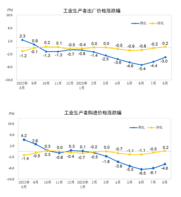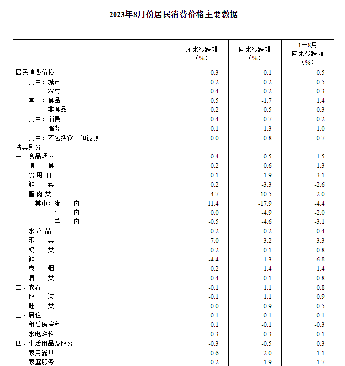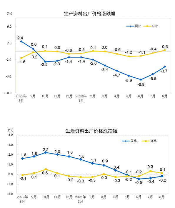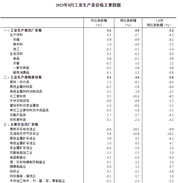 2023年8月份居民消费价格同比上涨0.1% 环比上涨0.3% 2023年8月份,全国居民消费价格同比上涨0.1%。其中,城市上涨0.2%,农村下降0.2%;食品价格下降1.7%,非食品价格上涨0.5%;消费品价格下降0.7%,服务价格上涨1.3%。1--—8月平均,全国居民消费价格比上年同期上涨0.5%。 8月份,全国居民消费价格环比上涨0.3%。其中,城市上涨0.2%,农村上涨0.4%;食品价格上涨0.5%,非食品价格上涨0.2%;消费品价格上涨0.4%,服务价格上涨0.1%。 ![]() 一、各类商品及服务价格同比变动情况 8月份,食品烟酒类价格同比下降0.5%,影响CPI(居民消费价格指数)下降约0.14个百分点。食品中,畜肉类价格下降10.5%,影响CPI下降约0.36个百分点,其中猪肉价格下降17.9%,影响CPI下降约0.28个百分点;鲜菜价格下降3.3%,影响CPI下降约0.07个百分点;蛋类价格上涨3.2%,影响CPI上涨约0.02个百分点;鲜果价格上涨1.3%,影响CPI上涨约0.03个百分点;粮食价格上涨0.6%,影响CPI上涨约0.01个百分点。 其他七大类价格同比五涨两降。其中,其他用品及服务、教育文化娱乐、医疗保健价格分别上涨3.8%、2.5%和1.2%,衣着、居住价格分别上涨1.1%和0.1%;交通通信、生活用品及服务价格分别下降2.1%和0.5%。 ![]() 二、各类商品及服务价格环比变动情况 8月份,食品烟酒类价格环比上涨0.4%,影响CPI上涨约0.10个百分点。食品中,蛋类价格上涨7.0%,影响CPI上涨约0.05个百分点;畜肉类价格上涨4.7%,影响CPI上涨约0.14个百分点,其中猪肉价格上涨11.4%,影响CPI上涨约0.13个百分点;鲜果价格下降4.4%,影响CPI下降约0.09个百分点。 其他七大类价格环比四涨一平两降。其中,交通通信、教育文化娱乐价格分别上涨1.0%和0.2%,居住、医疗保健价格均上涨0.1%;其他用品及服务价格持平;生活用品及服务、衣着价格分别下降0.3%和0.1%。 ![]() ![]() ![]() 附注 1.指标解释 居民消费价格指数(Consumer Price Index,简称CPI)是度量居民生活消费品和服务价格水平随着时间变动的相对数,综合反映居民购买的生活消费品和服务价格水平的变动情况。 2.统计范围 居民消费价格统计调查涵盖全国城乡居民生活消费的食品烟酒、衣着、居住、生活用品及服务、交通通信、教育文化娱乐、医疗保健、其他用品及服务等8大类、268个基本分类的商品与服务价格。 3.调查方法 采用抽样调查方法抽选确定调查网点,按照“定人、定点、定时”的原则,直接派人到调查网点或从互联网采集原始价格。数据来源于全国31个省(区、市)约500个市县、近10万家价格调查点,包括商场(店)、超市、农贸市场、服务网点和互联网电商等。 4.数据说明 由于“四舍五入”原因,有时会出现合计数据与分类数据高值或低值相同的情况。 2023年8月份工业生产者出厂价格同比下降3.0% 环比上涨0.2% 2023年8月份,全国工业生产者出厂价格同比下降3.0%,环比上涨0.2%;工业生产者购进价格同比下降4.6%,环比上涨0.2%。1—8月平均,工业生产者出厂价格比上年同期下降3.2%,工业生产者购进价格下降3.6%。 ![]() 一、8月份工业生产者价格同比变动情况 工业生产者出厂价格中,生产资料价格下降3.7%,影响工业生产者出厂价格总水平下降约2.90个百分点。其中,采掘工业价格下降9.9%,原材料工业价格下降4.0%,加工工业价格下降3.1%。生活资料价格下降0.2%,影响工业生产者出厂价格总水平下降约0.05个百分点。其中,食品价格下降0.2%,衣着价格上涨1.0%,一般日用品价格上涨0.6%,耐用消费品价格下降1.2%。 ![]() 工业生产者购进价格中,化工原料类价格下降10.4%,燃料动力类价格下降9.1%,建筑材料及非金属类价格下降6.0%,黑色金属材料类价格下降5.6%,农副产品类价格下降3.7%;有色金属材料及电线类价格上涨2.6%。 二、8月份工业生产者价格环比变动情况 工业生产者出厂价格中,生产资料价格上涨0.3%,影响工业生产者出厂价格总水平上涨约0.21个百分点。其中,采掘工业价格上涨0.9%,原材料工业价格上涨1.4%,加工工业价格下降0.2%。生活资料价格上涨0.1%,影响工业生产者出厂价格总水平上涨约0.02个百分点。其中,食品价格上涨0.6%,衣着价格下降0.2%,一般日用品价格下降0.3%,耐用消费品价格下降0.1%。 工业生产者购进价格中,农副产品类价格上涨1.7%,燃料动力类价格上涨1.1%,化工原料类价格上涨0.5%,有色金属材料及电线类价格上涨0.2%;建筑材料及非金属类价格下降1.4%,黑色金属材料类价格下降0.5%。 ![]() ![]() 附注 1.指标解释 工业生产者价格指数包括工业生产者出厂价格指数(Producer Price Index for Industrial Products, 简称PPI)和工业生产者购进价格指数。 工业生产者出厂价格指数反映工业企业产品第一次出售时的出厂价格的变化趋势和变动幅度。 工业生产者购进价格指数反映工业企业作为中间投入产品的购进价格的变化趋势和变动幅度。 2.统计范围 工业生产者出厂价格统计调查涵盖40个工业行业大类、1300多个基本分类的工业产品价格;工业生产者购进价格统计调查涵盖9大类、800多个基本分类的工业产品价格。 3.调查方法 工业生产者价格调查采取重点调查与典型调查相结合的调查方法,涉及全国4万多家工业企业。 4.统计标准 工业行业划分标准的依据是《国民经济行业分类》(GB/T4754-2017)。 5.数据说明 由于“四舍五入”原因,有时会出现合计数据与分类数据高值或低值相同的情况。部分分类或行业价格变动幅度较小,按“四舍五入“保留1位小数后涨跌幅为0,在表述价格变动情况时视