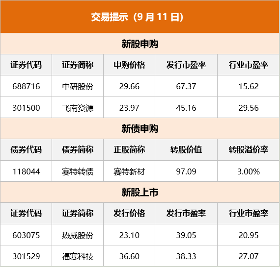 1、证监会:近日召开专家学者和境内外投资者座谈会。会议强调,行业机构要敢于、善于逆周期布局,加强专业能力建设,以长期稳定的投资回报赢得广大投资者信任。下一步,将认真研究与会人士提出的意见建议,研究出台更多务实、管用的政策举措,切实维护资本市场稳定健康发展,加大资本市场防假打假力度,依法严惩欺诈发行、虚假披露、违规减持等违法违规行为;要坚定对防范化解房地产风险的信心,坚定对防范化解地方债务风险的信心。 2、券商中国:近日,包括中信证券、中金财富、安信证券等在内的多家券商发布公告称,将于9月11日起,将融资保证金比例由此前的100%调降至80%。有的券商还特别表示,对于上市后前5个交易日的证券,融资保证金比例为200%。券商人士表示,此举将会适当提升融资的杠杆比例,有助于增加两融投资者可融资规模,满足投资者合理的融资交易需求,一方面引入增量资金,另一方面盘活存量资金,进而影响市场流动性和活跃度。 3、工信部:五部门印发《元宇宙产业创新发展三年行动计划(2023-2025年)》。其中提出,到2025年,元宇宙技术、产业、应用、治理等取得突破,成为数字经济重要增长极,产业规模壮大、布局合理、技术体系完善,产业技术基础支撑能力进一步夯实,综合实力达到世界先进水平。培育3—5家有全球影响力的生态型企业和一批专精特新中小企业,打造3—5个产业发展集聚区。 4、证监会:发布《行政处罚罚没款执行规则》。《执行规则》着力于为证监会罚没款执行工作提供一套全环节、可遵循的工作流程。对法律规定不明确或者以往处于模糊地带的内容予以进一步明确,规范罚没款执行工作,积极便利当事人缴纳罚没款,同时并没有新增当事人义务。 5、21世纪经济报道:广州首套房贷突破LPR下限,成为首个突破下限的一线城市。据悉最新的政策为,广州无房,首套房首付30%,利率为LPR-10%,即4.1%;广州有一套房无在供或者已经结清,二套房按照首付30%,利率也为LPR-10%;广州有一套房且在供,首付40%,利率为LPR+30BP,即4.5%,广州有2套房及以上者,暂停放发贷款。