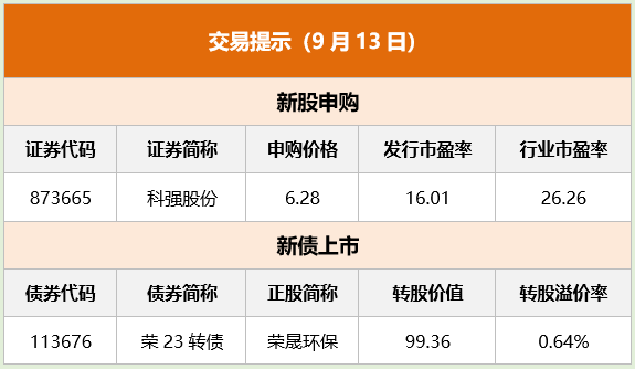 中国新闻网:有记者就中俄两国元首会否将于今年年底前会晤一事提问,对此,外交部发言人毛宁表示,习近平主席和普京总统一直通过各种方式进行战略沟通,就两国合作和共同关心的问题深入交流。两国元首将继续保持密切交往,引领中俄新时代全面战略协作伙伴关系不断向前发展。 财政部:发布关于印发《普惠金融发展专项资金管理办法》的通知。通知提出,为落实就业优先政策,支持重点群体就业创业,引导金融机构加大创业担保贷款投放,专项资金安排支出用于对财政贴息支持的创业担保贷款给予一定奖补。对符合条件的创业担保贷款,财政部门给予贷款实际利率50%的财政贴息。鼓励有条件的地方对创业担保贷款逐步降低或免除反担保要求。 中国新闻网:民政部社会救助司司长刘喜堂表示,今年1月至6月,全国累计支出低保、特困和临时救助资金1265亿元人民币,比较好地保障了困难群众基本生活。到今年6月底,全国城市和农村低保标准分别较去年同期增长4.8%、8.5%。 澎湃新闻:8月以来,江苏已有多地多家企业宣布退出政府融资平台。9月12日,邳州市交通工程有限公司、邳州市远通公共交通运输有限公司发布市场化转型说明,两家企业表示,地方政府隐性债务已清偿完毕,今后不再承担公益性项目融资职能,承诺企业自主经营、自负盈亏。近年来,多地国企、城投平台宣布退出政府融资平台。 21财经:近期多家理财子公司接到监管窗口指导,理财直接融资工具使用受到限制,不允许新增业务。接到通知的银行包括国有大行、股份制银行和城商行。一位股份制银行理财子公司人士表示,目前接到通知停掉直接融资工具,不过传统的信托通道的非标业务还是可以照常继续做。 每经网:9月12日,隔夜离岸人民币Hibor上涨51个基点至4.44%,为2022年4月以来最高。1个月期离岸人民币Hibor上涨66个基点至4.60%,为三周以来最高。3个月期离岸人民币Hibor上涨24个基点至4.11%,为2018年以来最高。