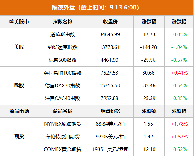 美股:道指收跌0.05%,报34645.99点;纳指收跌1.04%,报13773.61点;标普500指数收跌0.57%,报4461.90点。 欧股:德国DAX 30指数收跌0.54%,报15715.53点。法国CAC 40指数收跌0.35%,报7252.88点。英国富时100指数收涨0.41%,报7527.53点。 亚太股市:9月12日,香港恒生指数收跌0.39%,报18025.89点;恒生科技指数收跌0.47%,报4063.96点。日经225指数收涨0.97%,报32790.00点。韩国KOSPI指数收跌0.79%,报2536.57点。 新加坡财长:欧美、中国和日本竞相以高额补贴吸引半导体制造商前往设厂,小国如新加坡不可能也无意加入补贴竞赛,必要时可能须要放弃一些新的投资项目。尽管面对这些挑战,新加坡将继续拥有一个蓬勃和具有竞争力的半导体行业。 日本央行行长:如果日本央行对物价和工资将持续上涨有信心,“结束负利率”是可行的选择之一。至于具体的时间点,目前还没有到可以作出明确决定的阶段,央行有可能在年底前获得足够的信息和数据来判断工资是否会继续上涨。 财联社:美银对全球基金经理的调查显示,全球股票配置处于17个月高位,表明投资者情绪不再极度看空。但投资者也还没有看涨,因为股票依然为低配,现金水平也在上升。60%受访者认为“美联储已完成”紧缩;74%认为美联储将在明年第二季度实施首次降息。 界面新闻:当地时间9月12日,美国司法部针对谷歌的反垄断案开庭。美国司法部称,谷歌每年向苹果等公司支付超100亿美元,以维持其作为网络浏览器和移动设备上默认搜索引擎的地位,扼杀竞争。