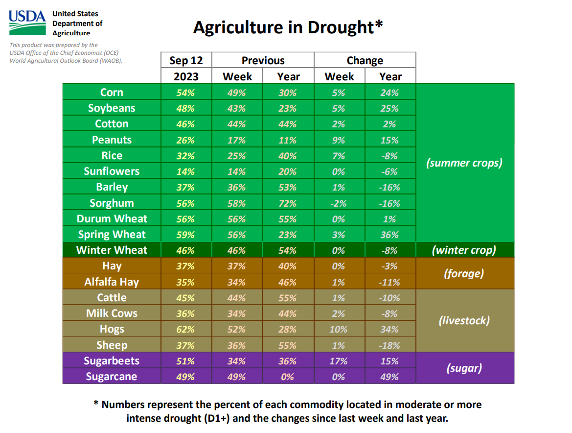 最新一周美国农作物受干旱影响的面积扩大 新华财经 09月14日 美国农业部(USDA)最新干旱报告显示,截至9月12日当周,约48%的美国大豆种植区域受到干旱影响,而此前一周为43%,去年同期为23%。约54%的美国玉米种植区域受到干旱影响,而此前一周为49%,去年同期为30%。约46%的美国棉花种植区域受到干旱影响,而此前一周为44%,去年同期为44%。(文章来源:新华财经) (责任编辑:admin)