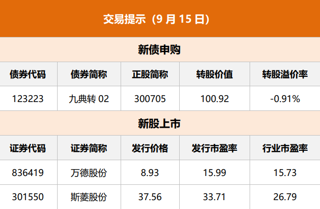 1、央行:9月15日下调存款准备金率0.25个百分点。当前,我国经济运行持续恢复,内生动力持续增强,社会预期持续改善。为巩固经济回升向好基础,保持流动性合理充裕,中国人民银行决定于2023年9月15日下调金融机构存款准备金率0.25个百分点(不含已执行5%存款准备金率的金融机构)。本次下调后,金融机构加权平均存款准备金率约为7.4%。 2、商务部:欧盟领导人正式宣布即将对中国电动汽车发起反补贴调查。中方对此表示高度关切和强烈不满。中方敦促欧盟从维护全球产业链供应链稳定以及中欧全面战略伙伴关系的大局出发,与中方开展对话磋商,为中欧电动汽车产业共同发展创造公平、非歧视、可预期的市场环境,共同反对贸易保护主义,共同致力于全球应对气候变化、实现碳中和的努力。中方将密切关注欧方保护主义倾向和后续行动,坚定维护中国企业的合法权益。 3、上海证券报:量化融券的公平性引发争议,量化私募人士表示,不存在不公平交易的问题。不少投资者认为,量化私募可以利用资金和交易量的优势,从券商处谋取融券的垄断性优势做T+0策略,从而影响交易的公平性。但多位量化私募人士则表示,这一说法不专业,由于融券具备公共池,具备融券资质的机构均可以进行借券,多家券商更是采用竞价模式出借券源,因此不存在不公平交易的问题。 4、澎湃新闻:高盛表示,中国股市有望在年底前出现上行的交易机会,维持中国股票超配。高盛研究部股票策略团队发表研究报告预测,受到五个因素的推动,中国股市有望在今年底前出现上行的交易机会,逐步趋向此前预测的MSCI中国指数67点位(潜在回报率10%)。这五个因素包括宽松政策提速、周期性改善、市场技术面向好、低估值和低仓位。 5、财联社:9月13日,标普香港创业板指数收报25.60点,年内跌幅达近30%,距离2007年标普香港创业板指数1823.74点的历史高位,几乎归“0”。被遗忘的香港创业板,除了指数下跌至几乎“抹零”外,更是已有32个月没有任何新股上市。不少业内人士认为,香港创业板交投冷淡,近期更有沦为“仙股”“庄股”基地倾向。