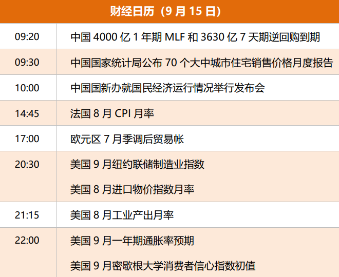 外交部:国务院总理李强将于9月17日出席在广西南宁举行的第20届中国—东盟博览会和中国—东盟商务与投资峰会开幕式并致辞。柬埔寨首相洪玛奈、老挝总理宋赛、马来西亚总理安瓦尔、越南总理范明政、印度尼西亚副总统马鲁夫、泰国副总理兼商业部长普坦等外国领导人和高级官员以及东盟秘书长高金洪将出席本届东博会开幕式。 中国网:国家发改委表示,争取早日实现两岸民众坐着高铁轻松跨过台湾海峡的梦想。国新办就《中共中央国务院关于支持福建探索海峡两岸融合发展新路建设两岸融合发展示范区的意见》举行发布会,国家发改委副主任丛亮表示,当前,两岸各界对两岸基础设施直接联通期盼已久。我们要共同努力,争取早日实现两岸民众坐着高铁轻松跨过台湾海峡的梦想,促进更多台湾地区的商品搭乘中欧班列等畅达欧亚市场,更好惠及两岸同胞。 商务部:下一步将继续推政策、抓落实、补短板、强优势,特别是针对市场和企业关注的问题,进一步地完善政策工具箱,如出台提升加工贸易发展水平的专项政策,促进服务贸易和数字贸易发展的相关政策等。将致力于培育外贸发展的动能,巩固创新基础,切实稳住外贸基本盘,为我国经济回升向好做出应有贡献。 国家医保局:2023年1-7月,基本医疗保险基金(含生育保险)总收入18611.60亿元,同比增长8.8%。基本医疗保险基金(含生育保险)总支出15528.66亿元,同比增长19.3%,职工基本医疗保险基金(含生育保险)支出9750.55亿元,同比增长20.1%。生育保险基金待遇支出616.42亿元。城乡居民基本医疗保险基金支出5778.11亿元,同比增长17.9%。 国家能源局:8月份,全社会用电量8861亿千瓦时,同比增长3.9%。第一、二、三产业用电量均呈现增长态势,同比分别增长8.6%、7.6%和6.6%,经济运行继续延续回升向好态势。 深圳市发改委:印发《关于支持深圳市基础设施领域不动产投资信托基金(REITs)高质量发展的若干措施》的通知。通知提出,扩大保障性租赁住房、仓储物流、产业园区、能源等存量领域基础设施REITs储备规模,支持谋划消费基础设施REITs,支持已上市的基础设施REITs持续扩募。 财联社:近期,国企宣告退出地方政府融资平台职能的案例数激增,自8月中旬以来的一个月内,江苏省内已有40多家国企宣告退出地方政府融资平台。分析人士指出,本轮国企或城投“退平台”呈现“集体退出”的特点,一份公告宣布退出平台的国企数量少则2-3家,多则10余家。“退平台”的目的在于满足中央、江苏省相关债务管理要求,其中特别提及2021年江苏省出台的《关于规范融资平台公司投融资行为的指导意见》。