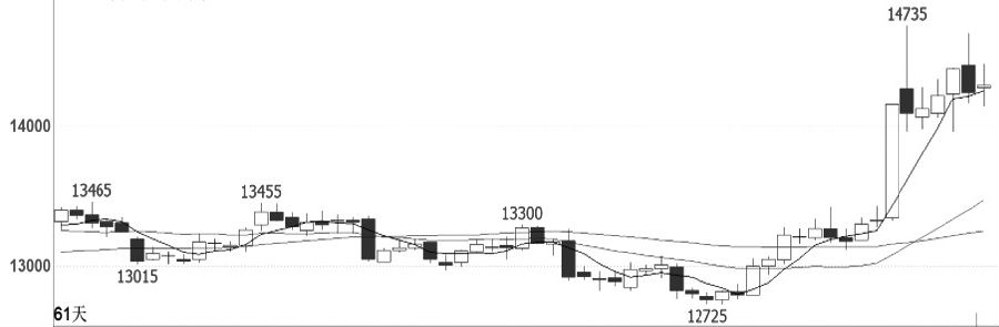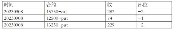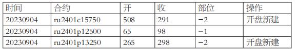 表2为9月1日持仓部位 阶段三 由图1可知,9月4日沪胶期货2401合约只是跳空高开,并没有出现涨停的情况。由图2可知,VIX数值明显高于60日均线。由于沪胶是国际品种,开盘没有涨停则很难再次涨停,故开盘就开始建立对冲部位。考虑到开盘价是14280元/吨,平值期权的行权价是14250元/吨,按照策略的基本原则,选择行权概率较低的期权,因此认购call选择行权价15750元/吨,认沽put选择行权价13250元/吨。此外,考虑到波动率在高位,因此开盘就建立两个部位ru2401c15750和ru2401p13250。事实上,该日行情以振荡为主,故不需要止损任何一个期权。 表3给出了9月4日该策略的持仓情况。15750元/吨的call部位盈利(508-291)×2=434元/吨,13250元/吨的put部位亏损(298-265)×2=66元/吨,12500元/吨的put部位亏损98-86=12元/吨。整体盈利434-66-12=356元/吨。