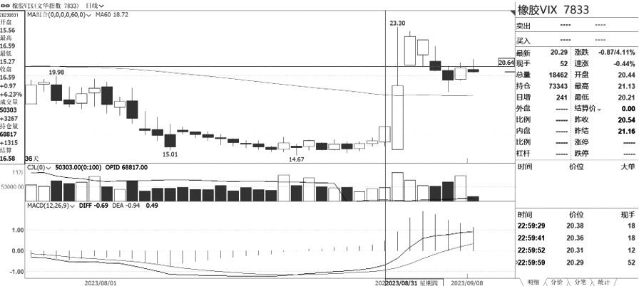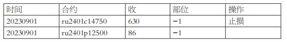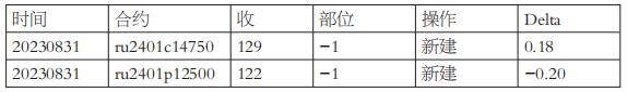 表1为8月31日持仓部位 阶段二 由图1可知,9月1日沪胶期货2401合约出现涨停。由图2可知,VIX数值突破了60日均线。这种涨停的行情过程中,首先要以止损为主。因此,先止损认购期权ru2401C14750部位。考虑到ru2401C14750的开仓价是129元/吨,按照亏损100%原则,故当其涨到258元/吨时止损。 表2给出了9月1日的持仓情况,其中ru2401C14750部位亏损258-129=129元/吨,ru2401p12500部位盈利122-86=36元/吨,整体亏损129-36=93元/吨。