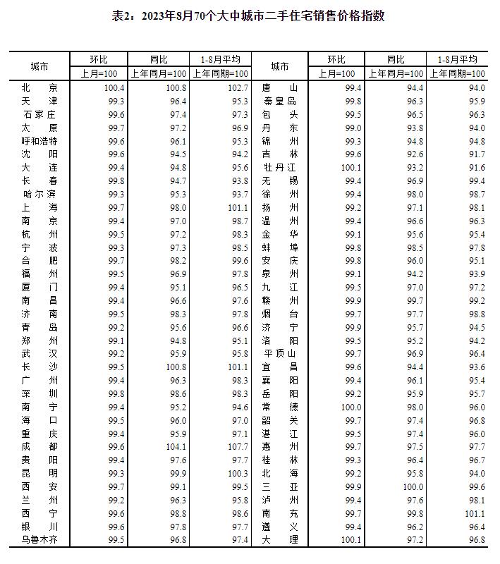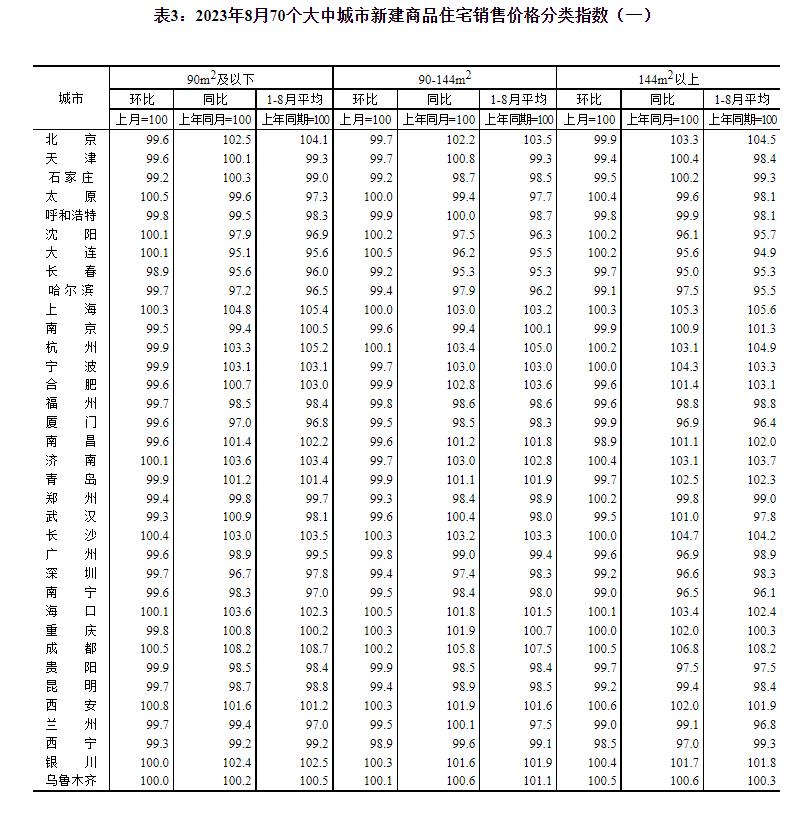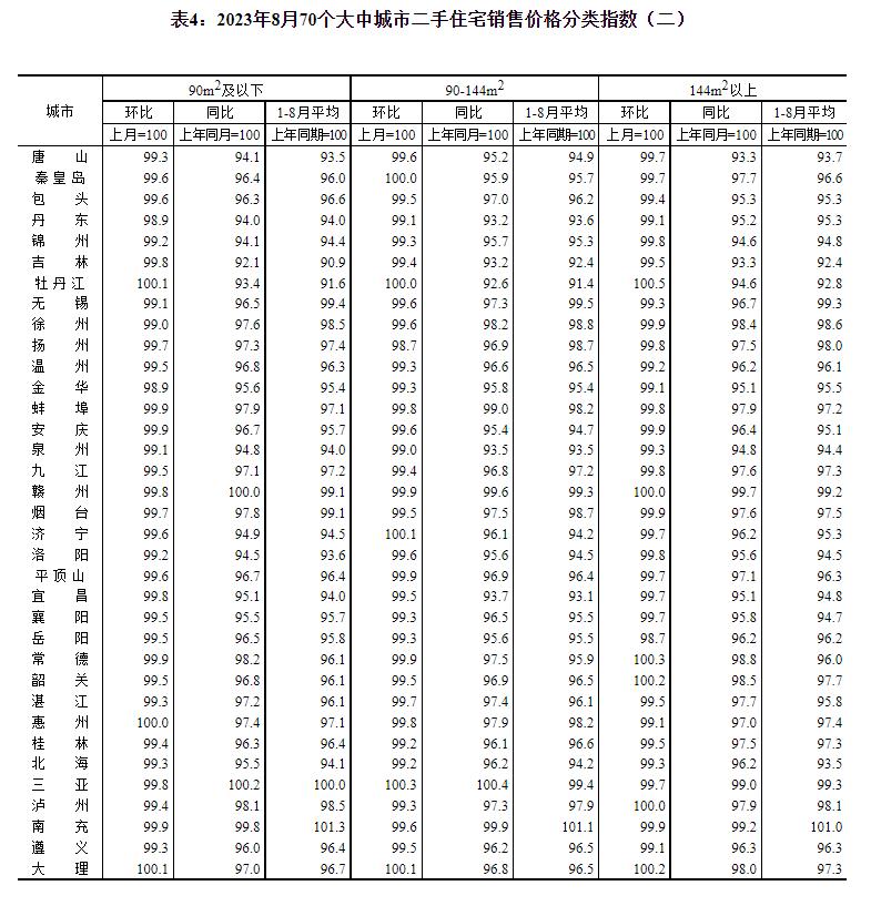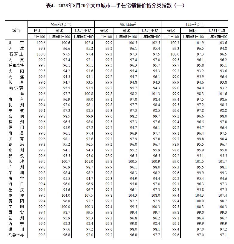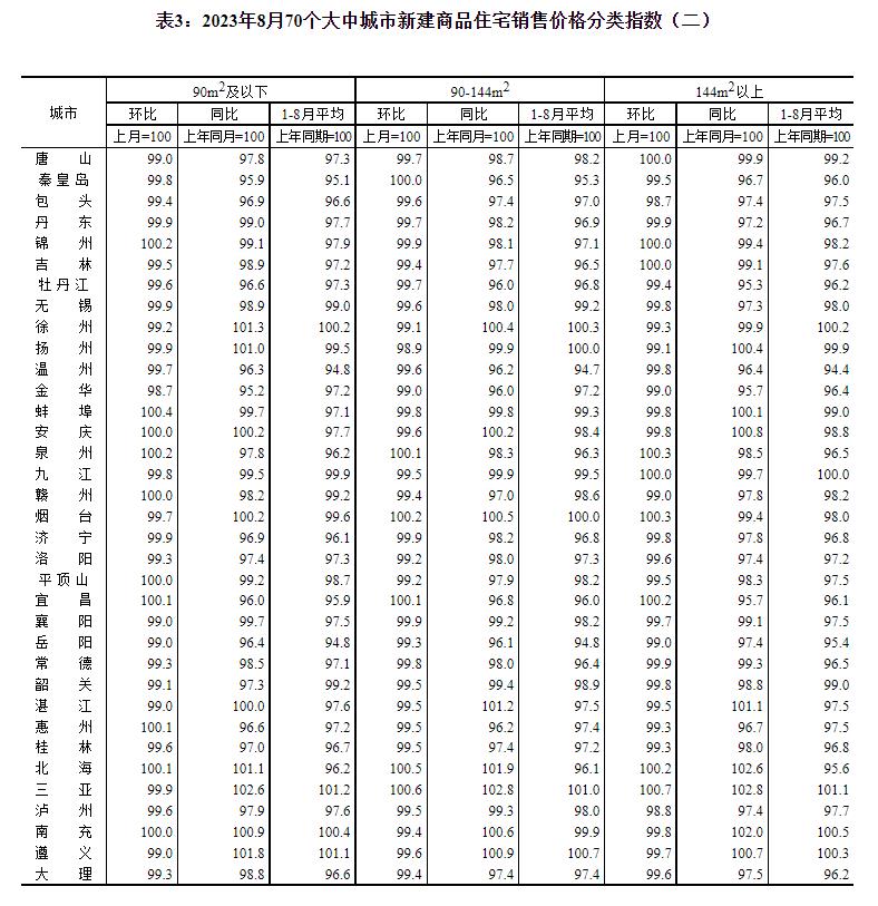 2023年8月份,70个大中城市商品住宅销售价格上涨城市个数减少,各线城市商品住宅销售价格环比下降、同比有涨有降。 一、各线城市商品住宅销售价格环比下降 从新建商品住宅看,8月份,一线城市新建商品住宅销售价格环比由上月持平转为下降0.2%,其中北京、广州和深圳环比分别下降0.2%、0.3%和0.6%,上海环比上涨0.1%;二线城市新建商品住宅销售价格环比下降0.2%,降幅与上月相同;三线城市新建商品住宅销售价格环比下降0.4%,降幅比上月扩大0.1个百分点。从二手住宅看,8月份,一线城市二手住宅销售价格环比下降0.2%,降幅比上月收窄0.6个百分点,其中北京环比上涨0.4%,上海、广州和深圳环比分别下降0.3%、0.6%和0.2%;二、三线城市二手住宅销售价格环比分别下降0.5%和0.4%,降幅均与上月相同。 8月份,70个大中城市中,新建商品住宅和二手住宅销售价格环比上涨城市分别有17个和3个,比上月均减少3个。 二、各线城市商品住宅销售价格同比有涨有降 8月份,一线城市新建商品住宅销售价格同比上涨0.6%,涨幅比上月回落0.4个百分点;二线城市新建商品住宅销售价格同比上涨0.3%,涨幅比上月扩大0.1个百分点;三线城市新建商品住宅销售价格同比下降1.4%,降幅比上月收窄0.1个百分点。8月份,一、二线城市二手住宅销售价格同比分别下降1.6%和3.0%,降幅比上月分别扩大0.2和0.3个百分点;三线城市二手住宅销售价格同比下降3.5%,降幅与上月相同。 8月份,70个大中城市中,新建商品住宅和二手住宅销售价格同比上涨城市分别有25个和3个,比上月分别减少1个和2个。 注释: 70个大中城市房地产价格统计一二三线城市划分:一线城市指北京、上海、广州、深圳等4个城市;二线城市指天津、石家庄、太原、呼和浩特、沈阳、大连、长春、哈尔滨、南京、杭州、宁波、合肥、福州、厦门、南昌、济南、青岛、郑州、武汉、长沙、南宁、海口、重庆、成都、贵阳、昆明、西安、兰州、西宁、银川、乌鲁木齐等31个城市;三线城市指唐山、秦皇岛、包头、丹东、锦州、吉林、牡丹江、无锡、徐州、扬州、温州、金华、蚌埠、安庆、泉州、九江、赣州、烟台、济宁、洛阳、平顶山、宜昌、襄阳、岳阳、常德、韶关、湛江、惠州、桂林、北海、三亚、泸州、南充、遵义、大理等35个城市。 2023年8月份70个大中城市商品住宅销售价格变动情况 ![]() ![]() ![]() ![]() ![]() ![]() 附注: 1.调查范围:各城市的市辖区,不包括县。 2.调查方法:新建商品住宅销售价格调查为全面调查,基础数据直接采用当地房地产管理部门的网签数据;二手住宅销售价格调查为重点调查和典型调查相结合,基础数据来源于房地产经纪机构上报、相关部门提供和调查员实地采价。 3.价格指数的计算方法详见《房地产价格统计报表制度》。 4.如当月无成交,则视为价格总体水平无变动。 (文章来源:国家统计局) (责任编辑:admin) |