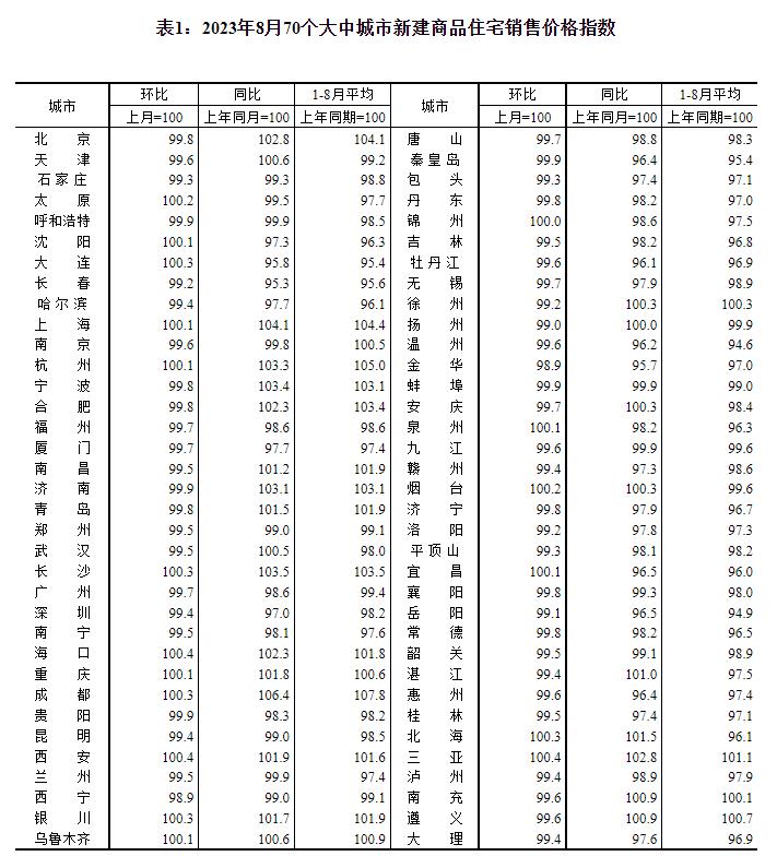 统计局:8月份各线城市商品住宅销售价格同比有涨有降