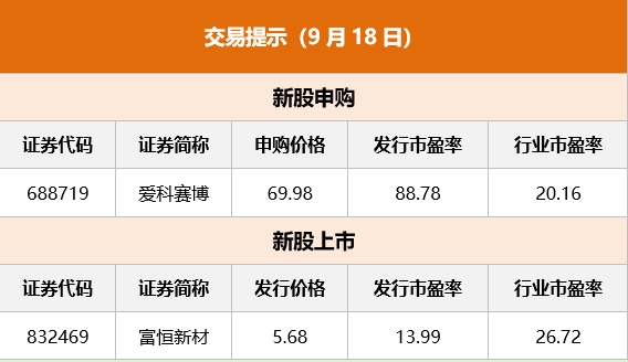 1、央行:自9月15日起,央行下调金融机构外汇存款准备金率2个百分点。同日,央行还超额续做5910亿元MLF操作,中标利率维持不变。同时开展1390亿元公开市场逆回购操作,其中有340亿元14天逆回购操作,中标利率相较前次操作下降20BP,这也是央行在时隔近8个月后再次开展14天期逆回购操作。 2、证监会:有关部门负责人在答记者问时表示,近期阶段性收紧IPO节奏,是维护市场稳健运行的安排,不存在IPO“关闸”的情况;目前,各板块的定位、发行和上市条件、信息披露要求等没有变化,不存在提高上市门槛的情形;证监会正在研究制定资本市场服务高水平科技自立自强的行动方案,进一步畅通“科技-产业-金融”良性循环。 3、证监会:通报于范易及其一致行动人违规减持“我乐家居”股票案调查进展,没收违法所得1653万元,并处罚款3295万元。本次违规减持发生前,于范易及其一致行动人合计持有“我乐家居”股票2244万余股,占公司总股本的7.11%。2023年9月5日至9月6日,于范易及其一致行动人将上述股票全部减持,未在减持比例到达5%时依法停止交易,后续违规成交金额1.07亿元,违法所得1653万元。我会拟依法没收于范易及其一致行动人前述违法所得,并从严处以3295万元罚款。下一步,证监会将抓紧完善关于减持股份的法规制度,进一步加大对违规减持行为的打击力度。 4、上交所:上海证券交易所和中证指数有限公司将于2023年10月17日正式发布上证回购指数。上证回购指数选取回购比例较高的50只证券作为指数样本,以反映沪市较高回购比例证券的整体表现。此外,中证指数有限公司将于2023年10月17日正式发布中证回购指数等3条指数。 5、界面新闻:东方时尚9月15日公告,公司实际控制人、董事长徐雄因涉嫌操纵证券市场罪,经上海市人民检察院第一分院批准逮捕。公司已针对相关事项做了妥善安排,目前公司生产经营不受影响,各项工作有序开展。公司董事会及管理层将加强经营管理,确保公司经营活动的正常进行。
