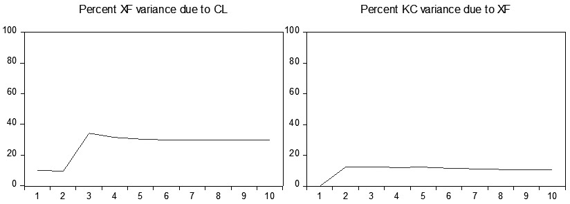 表5为 Granger因果检验结果 进一步通过对样本数据进行方差分解,探讨各因素在结构变化中的作用。图7表明在结构一中,随着时间推移,产量对消费的贡献度以及消费对库存的贡献度都得到了不同程度的增长。同时,能够明显看出,由于供应对消费的冲击明显高于消费对供应的影响,所以可以认为由Contango结构转向Back结构,供应端尤其是产量因素对驱动期限周期转向Back结构转变具有决定性作用。