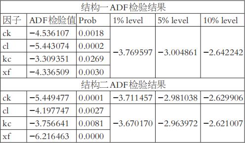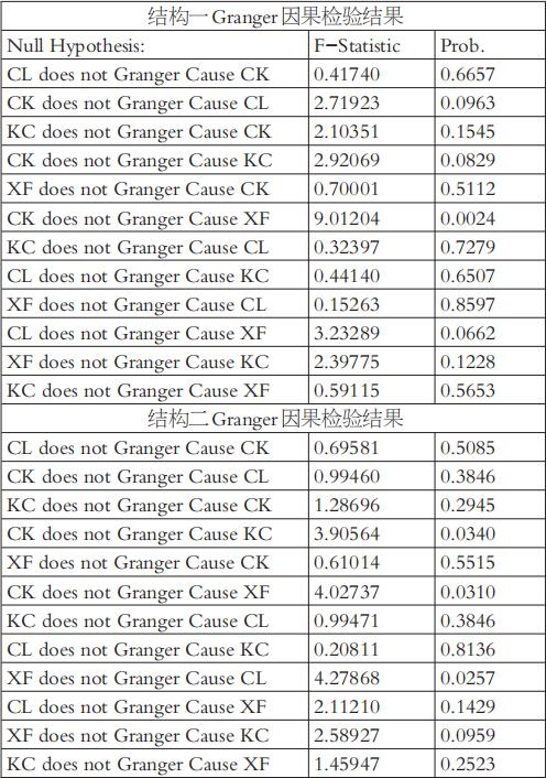 表4为ADF检验结果 本文所选取的因子数据均为月度数据。为深入研究因子对期限结构变动影响及消除单位根,故对所选取数据进行对数收益率化处理。就Contango结构转向Back结构(下称结构一)的主要影响因素与Back结构转向Contango结构(下称结构二)的主要影响因素分别进行研究。下面按周期不同对上述4个因子进行ADF检验,结果如表4所示。由表4可知,所有数据均通过了ADF检验,即样本数据为平稳数据。 接下来,对数据进行Granger因果检验,验证数据统计意义上的因果关系。结果如表5所示。从表5中能够看出,在结构一中,不能拒绝CK不是XF的Granger原因,即接受出口不是国内消费的Granger原因;在结构二中,接受出口不是库存和消费的Granger原因、消费不是产量的Granger原因。接受剩余假设为Granger原因。