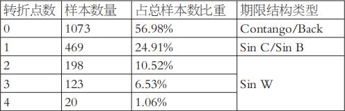 表1为样本数据转折点数统计 进一步根据不同的期限结构类型,对样本内所出现的次数进行统计,得到表2数据。从表2能够看出,Contango结构占比最高,这也符合经济市场运行的一般规律,表明棉花期货市场整体处于有效市场。
