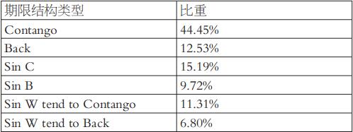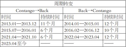 表2为样本内期限结构比重 按照前文对期限周期循环图的示意,依据转折点数量,对样本的期限周期转变进行时间划分,剔除处于稳定状态下的Contango结构和Back结构,得到表3数据。通过表中数据能够看出,稳定的期限结构一旦被破坏,其再次恢复成稳定的期限结构需要花费的时间周期多数维持在6—12个月,而这也可称为期限结构转变的循环时间周期。