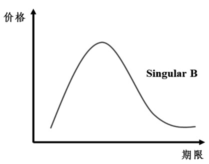 图3为 Singular Contango结构 图4为Singular Back结构(下称Sin B结构)。在由Back结构向Sin B结构转变的过程中,供需错配同样是形成Sin B结构的原因之一。不过,与Sin C结构相反,近期供应紧张局面得到缓解,近端价格率先坍塌,但是供应短缺的根本问题仍未得到解决,所以后端依然呈现Back结构。除此之外,仓单注销规则也会导致Back结构向Sin B结构转变。虽然市场中实际的供应未发生改变,但是根据交割规则要求,仓单会有强制注销,期货仓单库存会集中流向现货。此时,市场中流通的现货显性库存资源会因仓单集中注销而增加。因此,仓单强制注销,期货合约价格会在一定程度上受到压制。在由Contango结构向Sin B结构转变的过程中,因市场对后市需求持不乐观的态度,故远月合约价格率先回落,而近月合约的Contango结构尚在维持。
