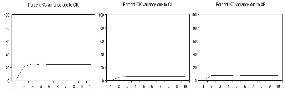 图7为结构一方差分解 图8表示了结构二的方差分解。表明在结构二中,随着期数增加,消费端对供应的带动作用明显高于供应端对需求的推动。其中,出口对供应的贡献度明显大于国内需求对供应的贡献度,这也和我国棉花消费大部分用于国外出口订单的现状相符。同时,对比图7与图8能够看出,产量在结构二中所能提供的贡献度显著弱化,这表明由Back结构转向Contango结构,主要是由需求端拉动,供应端对该结构转变的推动作用明显不如在结构一中的贡献力度。