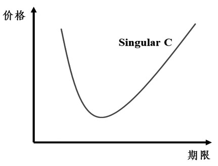 图2为棉花初步期限周期循环 在期货市场实际运行过程中,并非总呈现出完美的Contango或Back结构。当中间月份合约价格既高于(或低于)近端合约价格又高于远端合约价格时,即形成波峰(或波谷),此时便称市场的期限结构为奇异型结构(Singular)。期限结构发生改变,根本原因在于供需结构发生阶段性变化。图3表示的即为Singular Contango结构(下称Sin C结构)。对于由Contango结构向Sin C结构的转变,供应端的变动是其主要驱动力。由于短期市场供应紧张,近月合约价格大幅拉升,但是从长期来看,供需关系又将恢复至正常水平,故导致远月合约依旧保持Contango结构。在由Back结构向Sin C结构转变的过程中,远月合约价格得到拉升,除受到供应端影响外,此时市场对远月需求的预期较为乐观,故远期合约价格开始抬升。