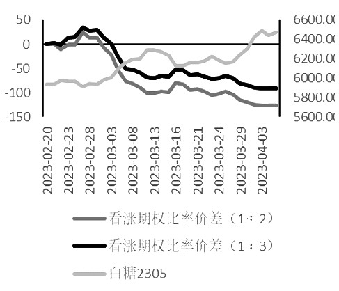 表为看跌期权比率价差策略到期损益情况 根据风险偏好与行情预期调整比率值 由于期权价格变动呈现非线性特征,组合的风险敞口随着行情的变化而变动,比率价差策略的优点在于投资者可以根据风险偏好与行情预期调整组合的比率值,但同时也存在风险敞口容易暴露的缺点。下面以上涨行情中的白糖期权为例,分析比率价差策略的风险敞口。 2023年上半年,白糖价格走出单边上涨行情,我们选用行权价5800元/吨和6100元/吨的5月合约进行实盘验证。看涨比率价差策略为买入1手实值看涨期权的同时卖出2手或者3手虚值看涨期权,看跌比率价差策略为买入1手实值看跌期权的同时卖出2手或者3手虚值看跌期权。 从组合损益表现来看,由看涨期权或者看跌期权构建的比率价差策略都处于亏损状态,看涨比率价差策略到期亏损分别为186元/吨(1:2组合)、534.5元/吨(1:3组合);看跌比率价差到期亏损分别为126元/吨(1:2组合)、90.5元/吨(1:3组合)。该时间段白糖5月合约连续上涨,看涨比率价差策略中的卖出看涨期权由虚值转变为实值,浮亏逐渐增大。相比之下,看跌期权比率价差策略中的看跌期权权利仓也处在亏损状态。但不同的是,上涨行情中,看涨期权义务仓风险敞口逐步扩大,而看跌期权权利仓风险敞口损失有限。