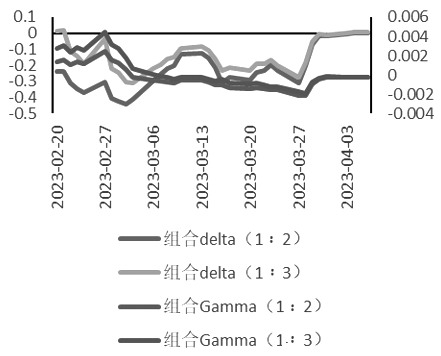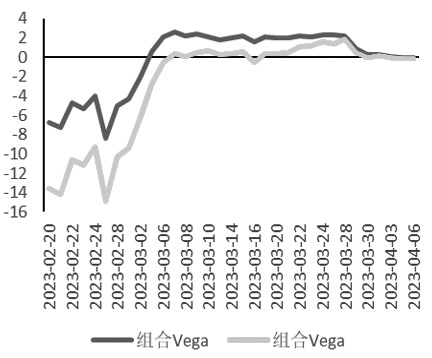 图为看跌期权比率价差策略Delta与Gamma值变化 在连续上涨行情中,看涨期权比率价差策略的风险敞口逐渐放大,而看跌期权比率价差策略的风险有限。通常,在持有实值看涨期权的基础上卖出更多数量的虚值看涨期权,投资者建仓目的是希望期权标的走出一波幅度有限的上涨行情。从盈亏走势图中可以看出,建仓初期,白糖5月合约自5932元/吨开始上涨,直到2023年3月6日,至6100元/吨关口附近,1:2的看涨比率价差策略几乎没有盈利,1:3的看涨比率价差策略出现亏损。投资者可能会费解,标的上涨至虚值看涨期权行权价附近,组合为什么几乎不盈利。其中重要的原因是,白糖上涨带动期权隐含波动率上升,看涨期权比率价差策略的Vega风险敞口开始放大。 从波动率风险敞口来看,买入期权的数量少于卖出期权的数量,隐含波动率的负相关风险更大。在实盘数据中,建仓初期,各个组合的Vega均为负值,其中看涨期权比率价差策略的Vega值从-6.9273(1:2组合)、-13.7848(1:3组合)变为到期时的-0.2392(1:2组合、-0.3588(1:3组合);看跌期权比率价差策略的Vega值从-6.7207(1:2组合)、-13.5959(1:3组合)变为到期时的-0.0683(1:2组合)、-0.1634(1:3组合),Vega负值随着时间的推移整体趋于零。对比两种比率价差策略,看涨期权比率价差策略保持负Vega值的时间周期更长,而看跌期权比率价差策略Vega值在中途收敛且随后高于零,原因是随着标的连续上涨,建仓时卖出的虚值看跌期权变为深度看跌期权,Vega趋于零,而建仓时买入的实值看跌期权变为浅度虚值,Vega大于零。其间白糖期权合约隐含波动率持续上升,为看涨期权比率价差策略带来风险。