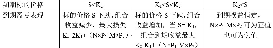 表为看涨期权比率价差策略到期损益情况 其中,K1、K2分别为期权合约行权价,且K1<K2,S为标的市场价格,C1、C2分别为行权价K1、K2的看涨期权权利金,P1、P2分别为行权价K1、K2的看跌期权权利金,M、N分别为期权合约的数量,且M<N。 看跌期权比率价差策略 看跌期权比率价差策略在连续大涨行情中最大损失有限,也可以实现盈利,策略基于的行情预期与看涨期权比率价差策略相反。当标的价格在行权价K1与K2之间时,随着标的价格S的下跌,组合到期损益与S成反比关系,当到期标的价格为K1时,组合收益最大,为K2-K1+(N×P1-M×P2)。当标的价格S向下跌破K1,组合到期收益逐渐变小,随着标的进一步下跌,组合甚至出现亏损,潜在风险开始扩大。对比前文,构建看跌期权比率价差策略是投资者认为期权标的将振荡下跌,但在到期时大概率不会跌破K1,且这种不跌破K1的预期比熊市垂直价差策略更强烈。