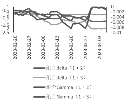 图为看跌期权比率价差策略盈亏走势 方向敞口方面,看涨期权比率价差策略与看跌期权比率价差策略在组合Delta与Gamma值方面差别较大,即在上涨行情中,二者在方向上的风险敞口不一样。看涨期权比率价差策略的组合Delta值随着行情变化逐步扩大,由建仓时的0.2554(1:2组合)、0.0065(1:3组合)变为到期时的-0.9562(1:2组合)、-1.9343(1:3组合),负值不断扩大反映了组合在白糖上涨行情中的亏损扩大。相比之下,看跌期权比率价差策略的组合Delta值由建仓时的-0.2381(1:2组合)、-0.0121(1:3组合)变为到期时的-0.0001(1:2组合)、-0.0051(1:3组合),均趋于零,反映了看跌期权比率价差在连续上涨行情中的亏损速度放缓,直到最大损失恒定。