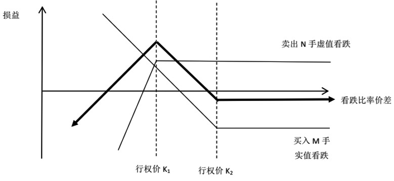 价差组合策略分类 垂直价差策略 垂直价差策略由同一月份不同行权价的看涨期权或者看跌期权组成,包括看涨期权组成的牛市价差、熊市价差策略,以及看跌期权组成的牛市价差、熊市价差策略。此类组合最大盈亏均有限,最大盈利与最大亏损的绝对值相加等于两个合约的行权价间距。 水平价差策略 水平价差策略由不同月份同一行权价的看涨期权或者看跌期权组成,构造水平价差是基于远近月份合约之间隐含波动率以及时间价值衰退速度不同。当近月合约隐含波动率大幅高于同一行权价的远月合约时,可以通过卖出近月合约再买入同一行权价的远月合约作为对冲,因为近月合约时间价值流失速度更快,既可以捕捉到隐含波动率期限差,也可以套取时间价值收益。 对角价差策略 对角价差策略是由不同行权价和不同到期日的期权构成的价差组合策略,比如买入1手远月行权价较低的看涨期权,再卖出1手近月行权价较高的看涨期权,该组合属于对角价差策略,与普通牛市价差策略的区别在于合约到期月份不一致。牛市价差策略与对角牛市价差策略的市场预期存在不同之处,虽然都是看好后市,但后者更倾向于近期盘整远期上涨的预期,即在较远期看多的基础上,通过卖出短期虚值看涨期权收取权利金,以降低成本。 比率价差策略 比率价差策略是买入一定数量的期权同时卖出更多数量的期权。买入的期权与卖出的期权有着相同的到期日,但行权价不同。比如买入1手实值看涨期权,同时卖出2手虚值看涨期权。比率根据投资者预期进行调整,通过调整比率,可以实现比例价差组合持仓的Delta总和接近零。比率价差策略是Delta中性策略的实现方式之一。若由同一到期月份的合约构成,则为垂直比率价差策略;若由到期月份不一样的合约构成,则为对角比率价差策略。顾名思义,对角比率价差策略综合了比率价差策略与对角价差策略的特点,买入一定数量的远月期权,同时卖出更多数量的近月期权,且行权价不同。本文重点对垂直比率价差策略的风险敞口进行分析。 比率价差到期损益 通常,期权比率价差策略以同一到期月份的垂直比率价差策略为主。 看涨期权比率价差策略 投资者可以根据自身预期动态调整比率,比率价差策略在实际操作中可以灵活运用:当持有的买入看涨期权被套住,如果预期标的物上涨幅度有限,上方面临强阻力,那么可以在持有买入看涨期权的基础上,再卖出虚值看涨期权,当买入看涨期权与卖出虚值看涨期权比率为1:1时,为垂直价差策略,而比率为1:2等其他比率值时,为看涨期权比率价差策略。 看涨期权比率价差策略在连续大跌行情中最大损失有限,也可以实现盈利,主要取决于买入看涨期权花费的权利金成本与卖出看涨期权收到的权利金收入之间的差值。当标的价格在行权价K1与K2之间时,随着标的价格S的上涨,组合到期损益与S成正比关系,当到期标的价格为K2时,组合收益最大,为K2-K1+(N×C2-M×C1)。当标的价格S向上突破K2,组合到期收益与S成反向变动,此时潜在风险开始扩大。因此,构建看涨期权比率价差策略的基础是投资者认为期权标的将振荡上涨(如果投资者预期会连续大涨,不适合采用看涨期权比率价差策略,直接买入看涨期权即可),但在到期时大概率不会涨过K2,且这种不突破K2的预期比牛市垂直价差策略更强烈。